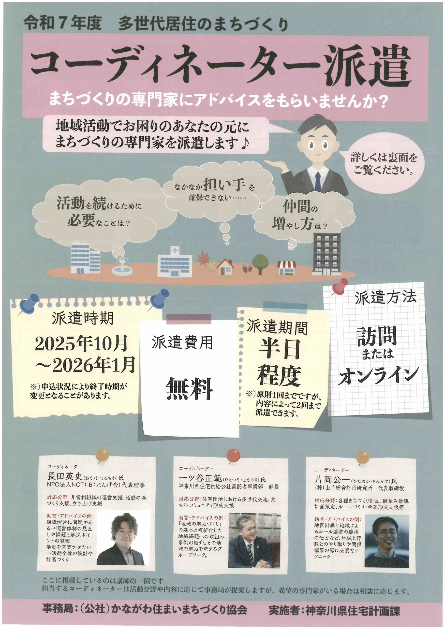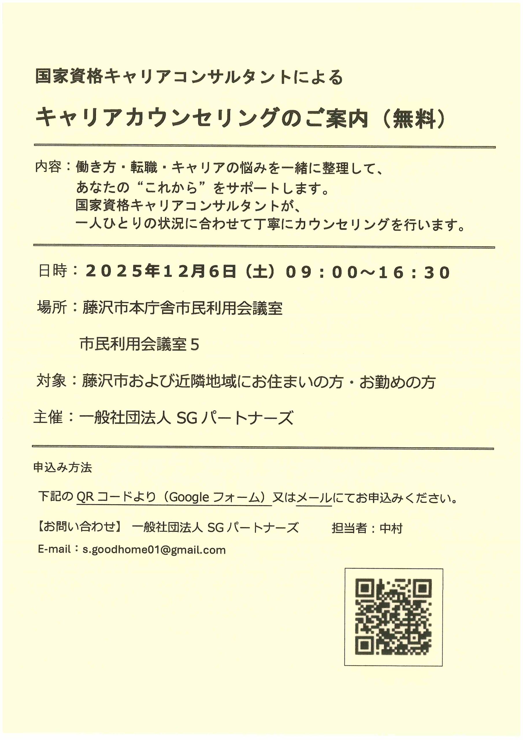 日時:2025年12日6日(土)09:00~16:30 場所:藤沢市本庁舎市民利用会議室 市民利用会議室5 対象:藤沢市および近隣地域にお住まいの方・お勤めの方 主催:一般社団法人 SG パートナーズ PDF情報No.1 […]