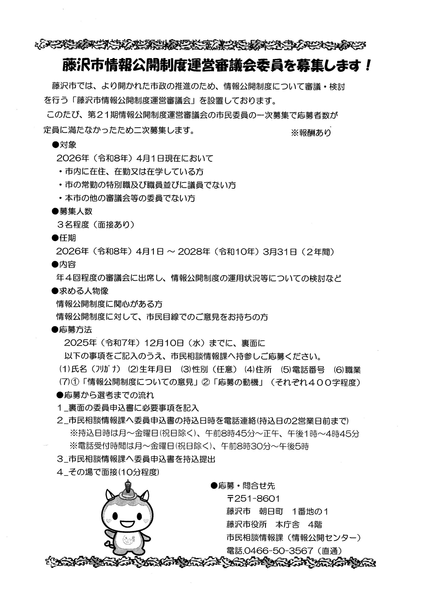 応募締切:2025年(令和7年)12月10日(水)まで 任期:2026年(令和8年)4月1日 ~ 2028年(令和10年)3月31日(2年間) ※報酬あり PDF情報No.114805 藤沢市では、より開かれた市政の推進 […]