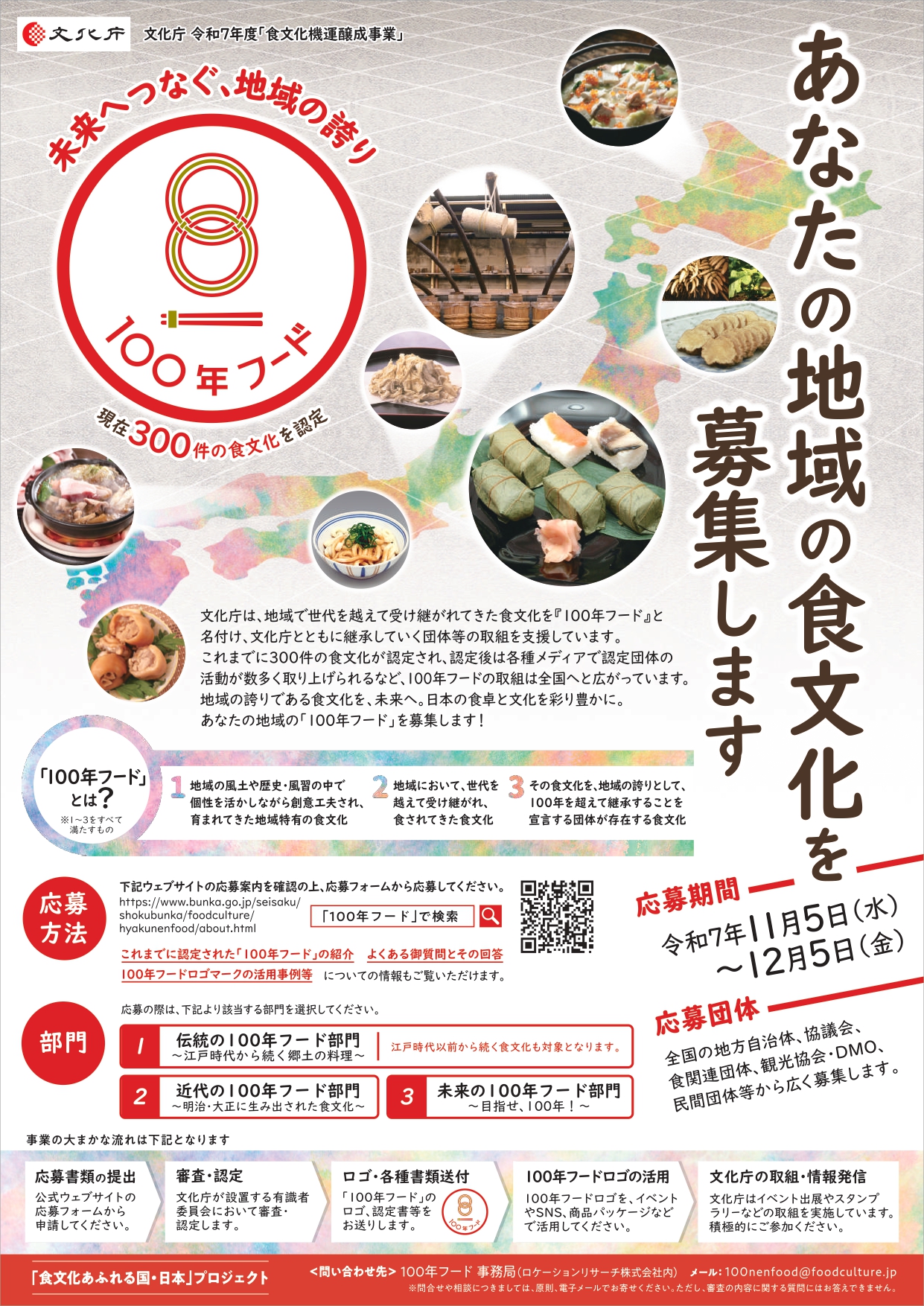 応募期間:令和6年11月5日(火)~令和6年12月5日(金) PDF情報No.114811 文化庁は、地域で世代を越えて受け継がれてきた食文化を『100年フード』と名付け、文化庁とともに継承していく団体等の取組を支援して […]