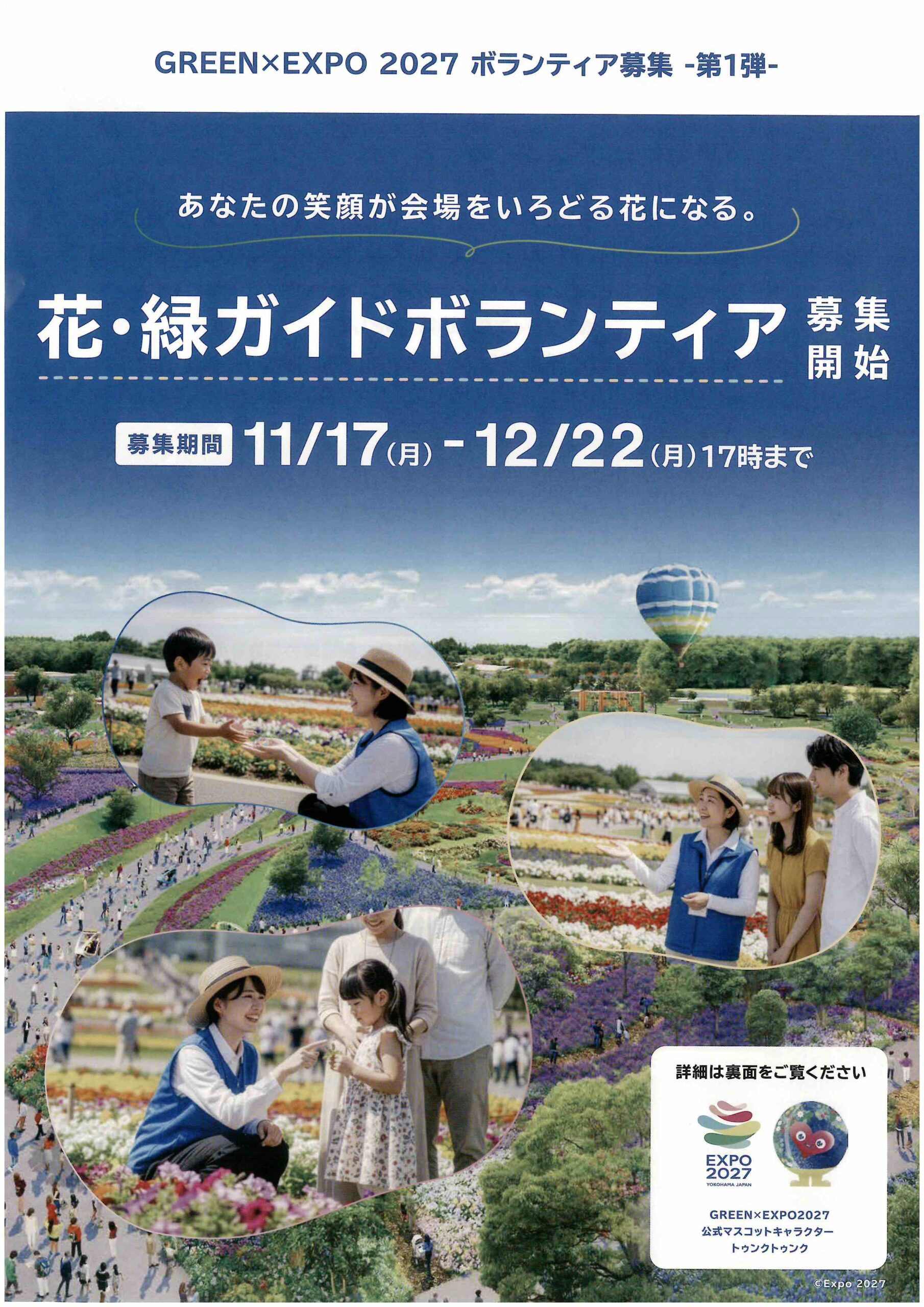募集期間:11/7(月)-12/22(月)17時まで PDF情報No.114847 GREEN×EXPO 2027を共に盛り上げ支えていただくパートナーとして、ボランティアを募集します。 国内外からの来場者やボランティア […]