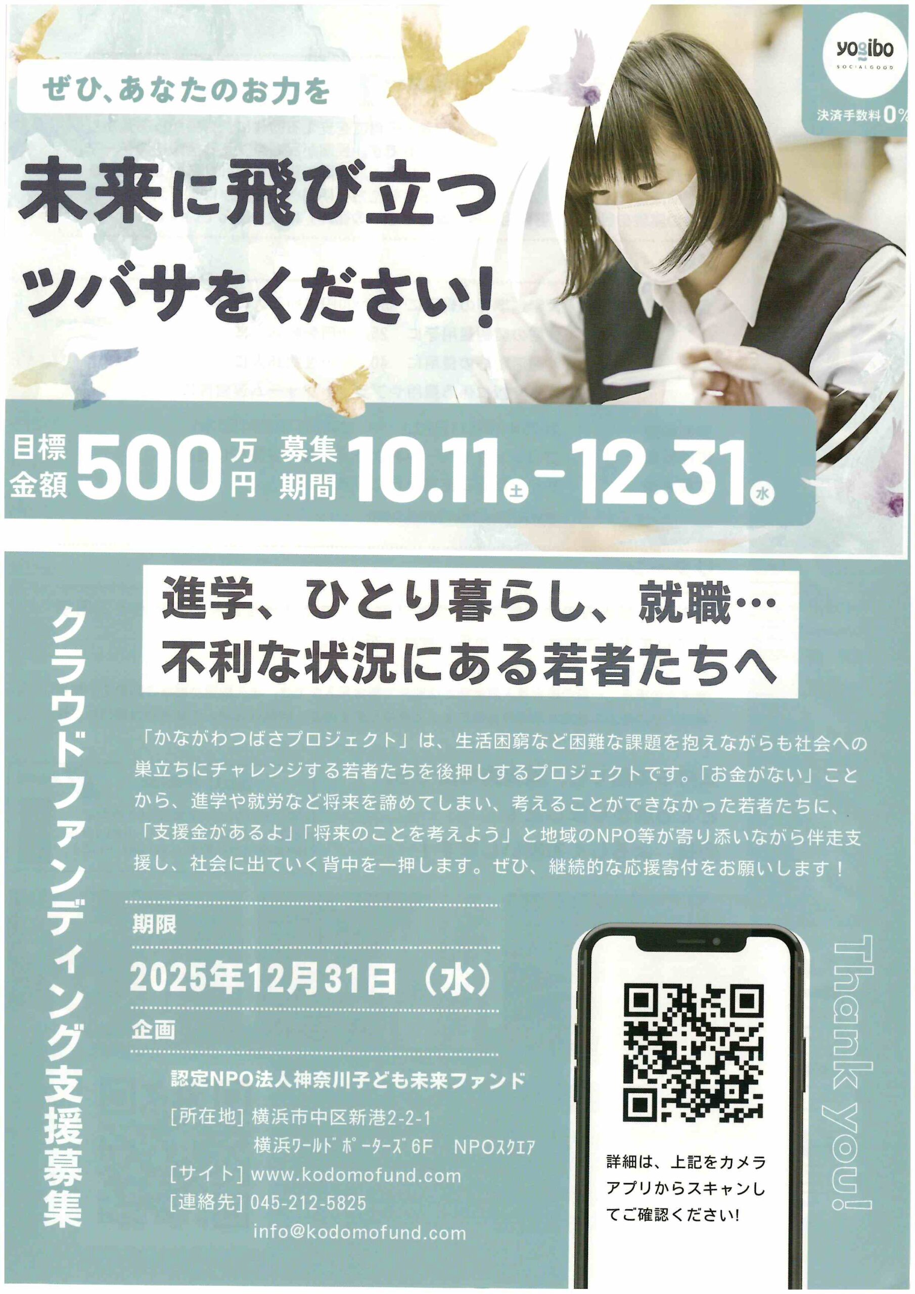 目標金額500万円 PDF情報No.114874 「かながわつばさプロジェクト」は、生活困窮など困難な課題を抱えながらも社会への巣立ちにチャレンジする若者たちを後押しするプロジェクトです。「お金がない」ことから、進学や就 […]