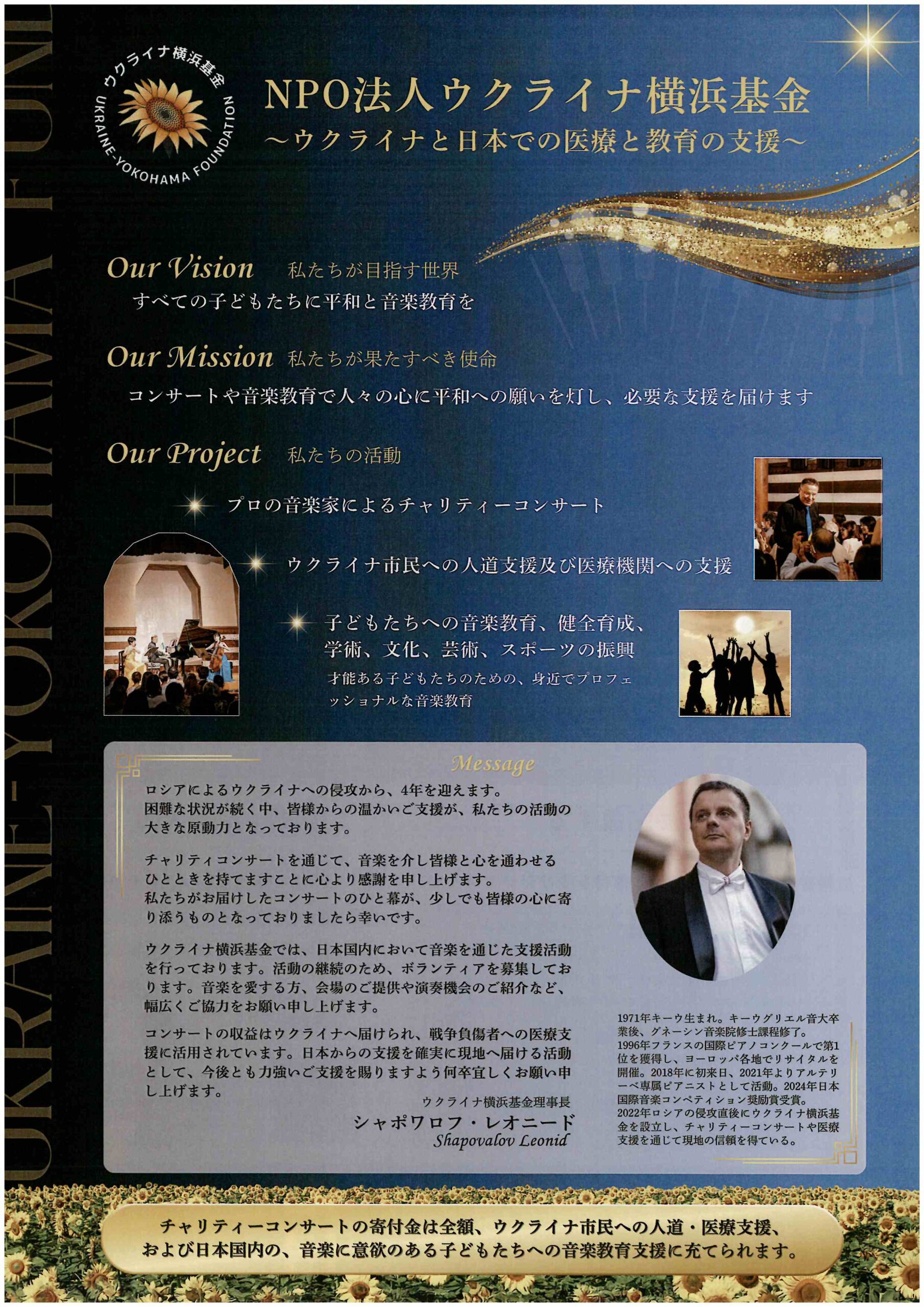 ウクライナ横浜基金 PDF情報No.115465 Our vision 私たちが目指す世界 すべての子どもたちに平和と音楽教育を Our Mission 私たちが果たすべき使命 コンサートや音楽教育で人々の心に平和への願 […]
