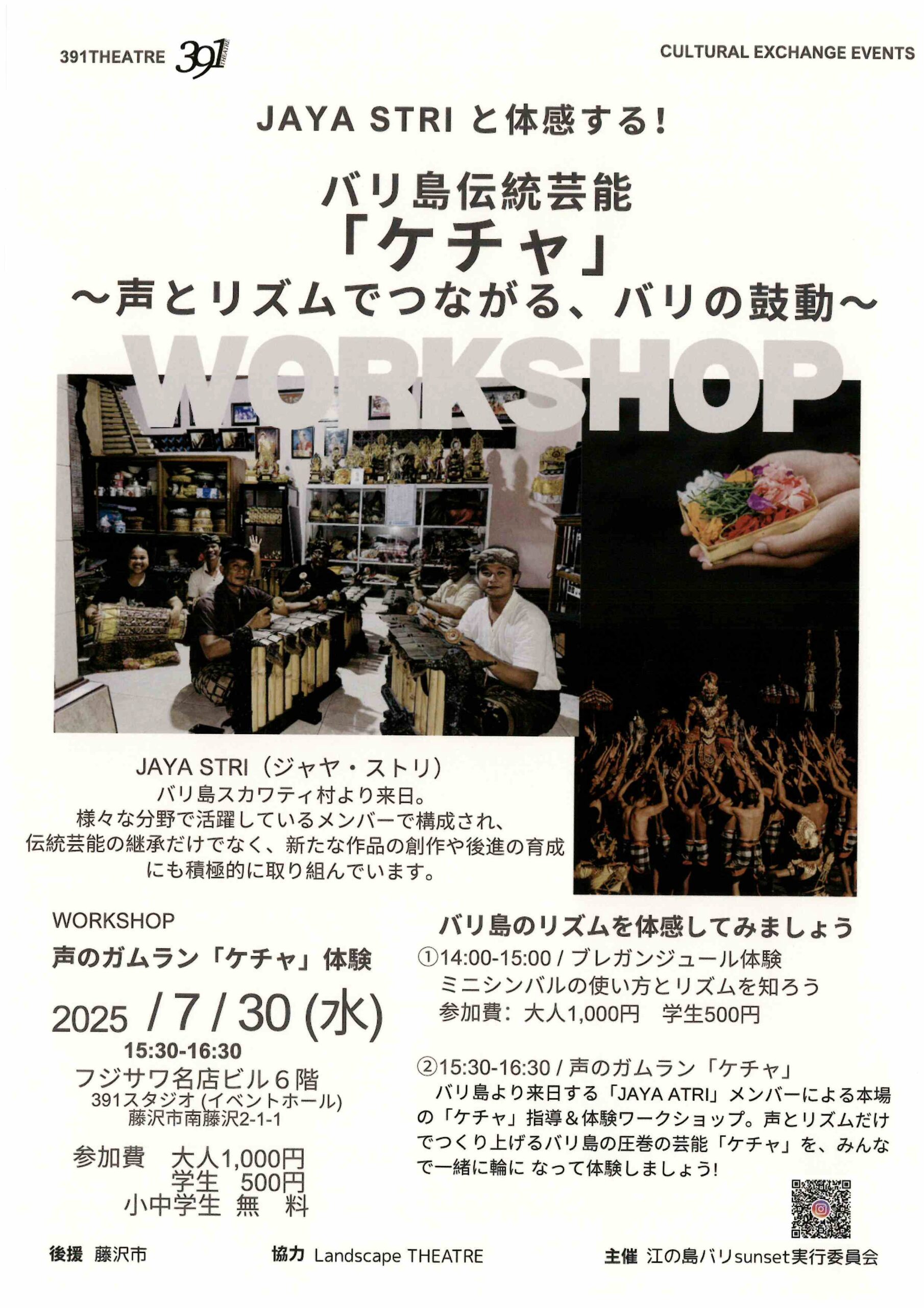 バリ島より来日する「JAYAATRl」メンバーによる本場の「ケチャ」指導&体験ワ ークショップ。 声とリズムだけでつくり上げるバリ島の圧巻の芸能「ケチャ」を、 みんなで一緒に輪になって体験しましょう!