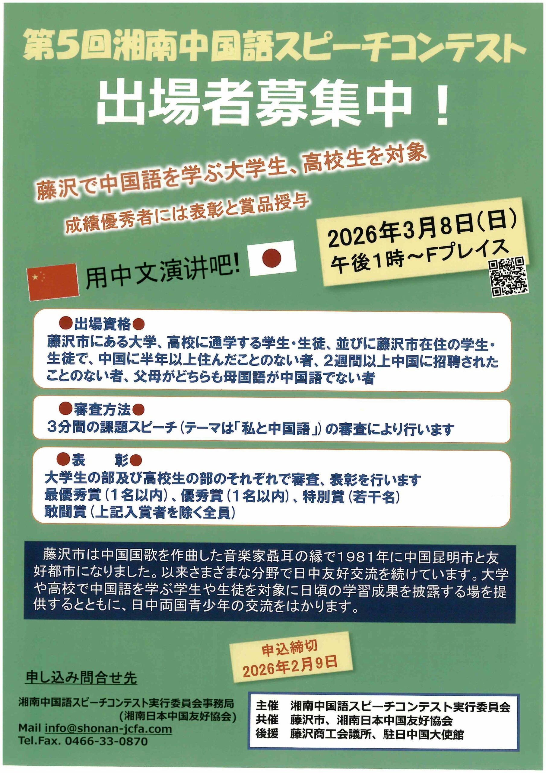 出場資格:藤沢市にある大学、高校に通学する学生・生徒、並びに藤沢市在住の学生・生徒で、中国に半年以上住んだことのない者、2週間以上中国に招聘されたことのない者、父母がどちらも母国語が中国語でない者