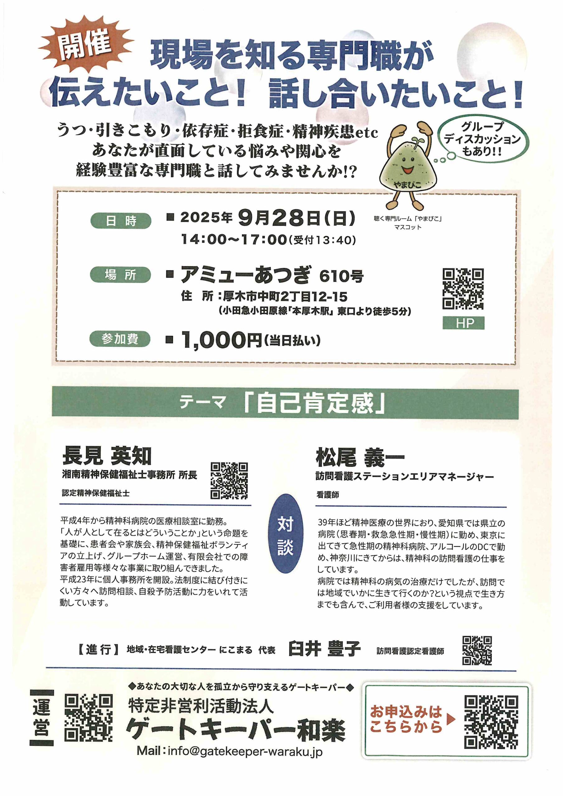 うつ・引きこもり・依存症・拒食症・精神疾患etc、あなたが直面している悩みや関心を経験豊富な専門職と話してみたい方。「テーマ」自己肯定感に興味がある方