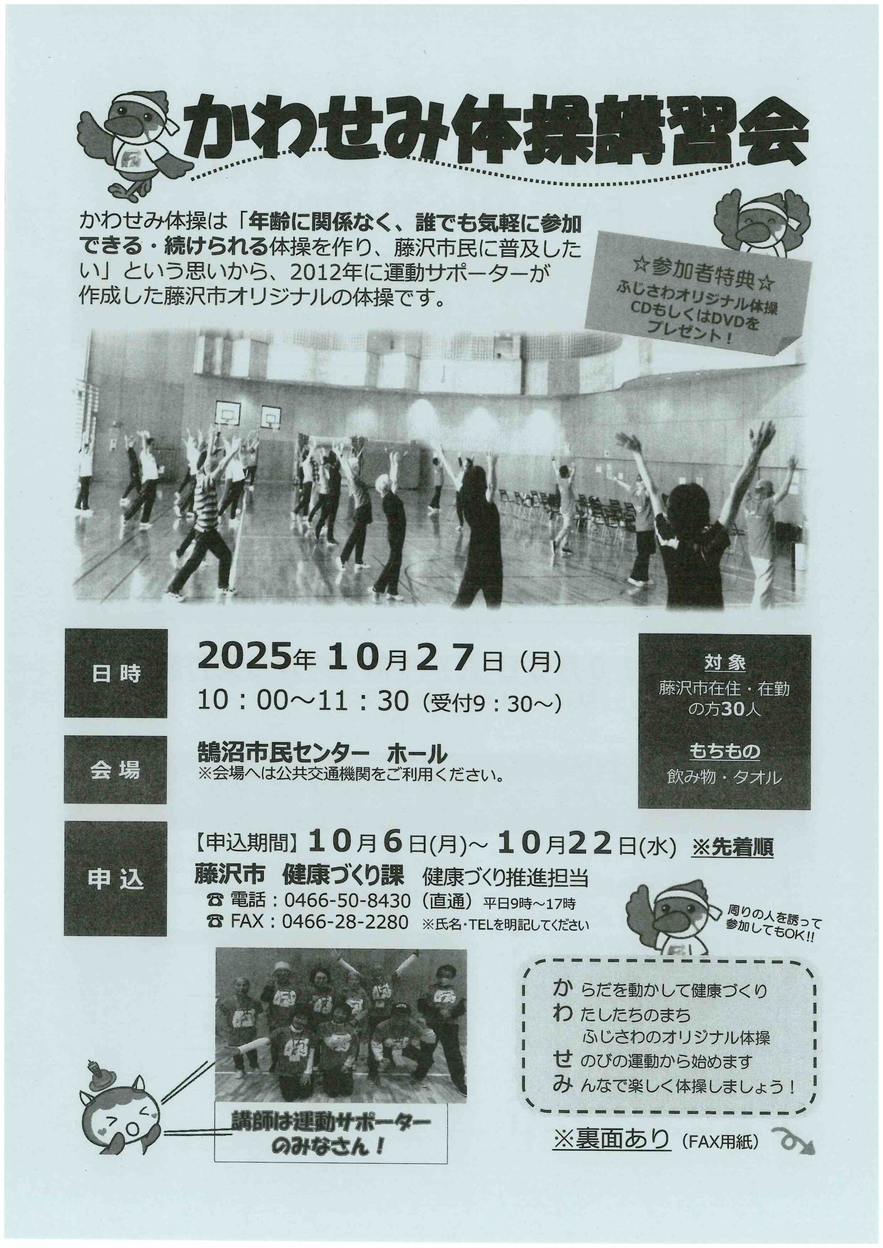 かわせみ体操は「年齢に関係なく、誰でも気軽に参加できる・続けられる体操を作り、藤沢市民に普及したい」という思いから、2012年に運動サポーターが作成した藤沢市オリジナルの体操です。