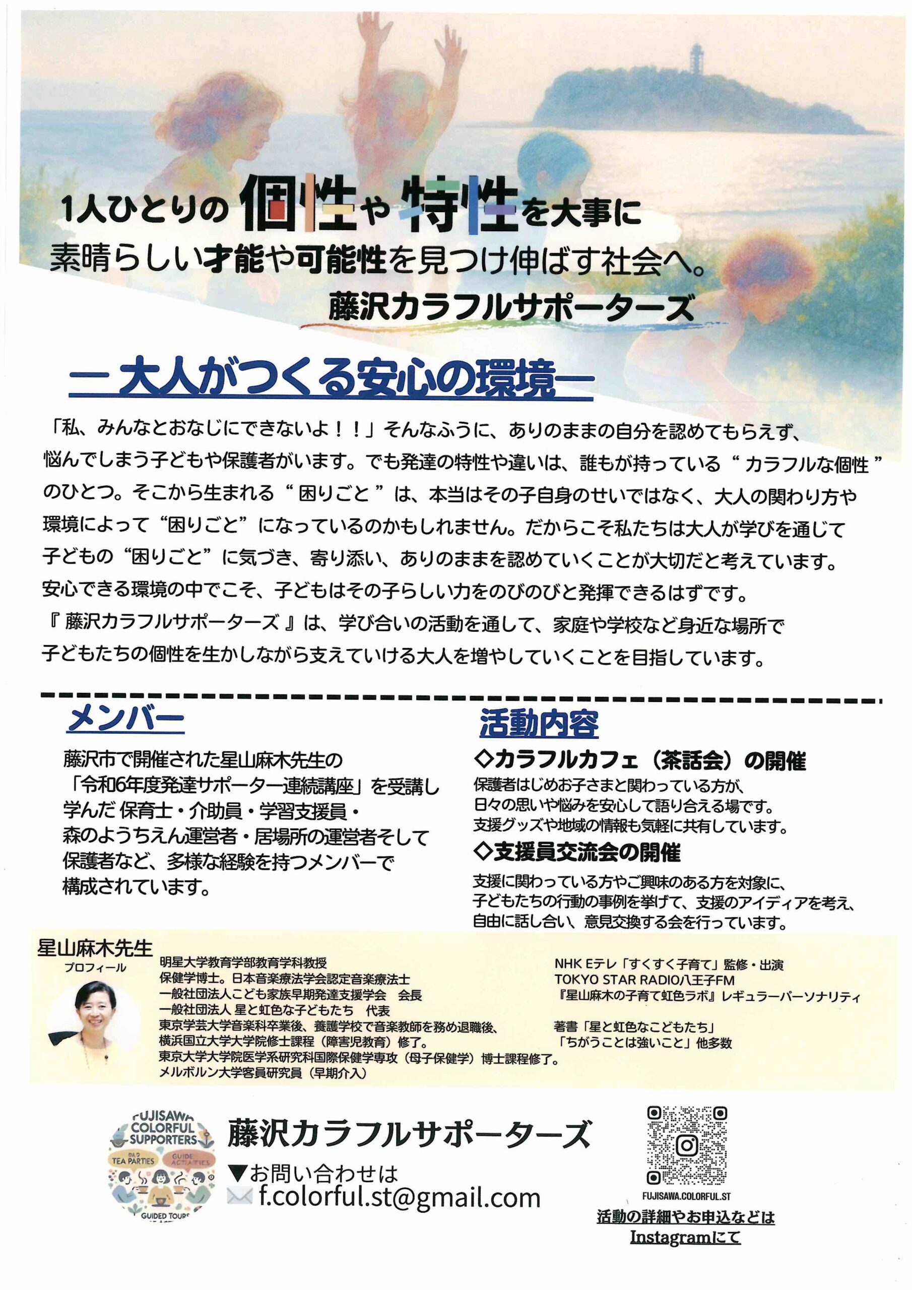 安心できる環境の中でこそ、子ともはその子らしい力をのびのびと発揮できるはずです。『藤沢カラフルサポーターズ』は、学び合いの活動を通して、家庭や学校など身近な場所で子ともたちの個性を生かしながら支えていける大人を増やしていくことを目指しています。
