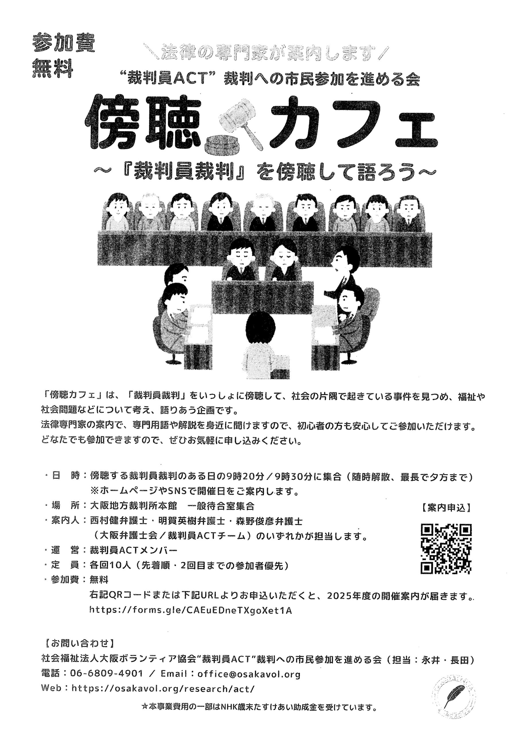 「傍聴カフェ」は、「裁判員裁判」をいっしょに傍聴して、社会の片隅で起きている事件を見つめ、福祉や社会問題などについて考え、語りあう企画です。