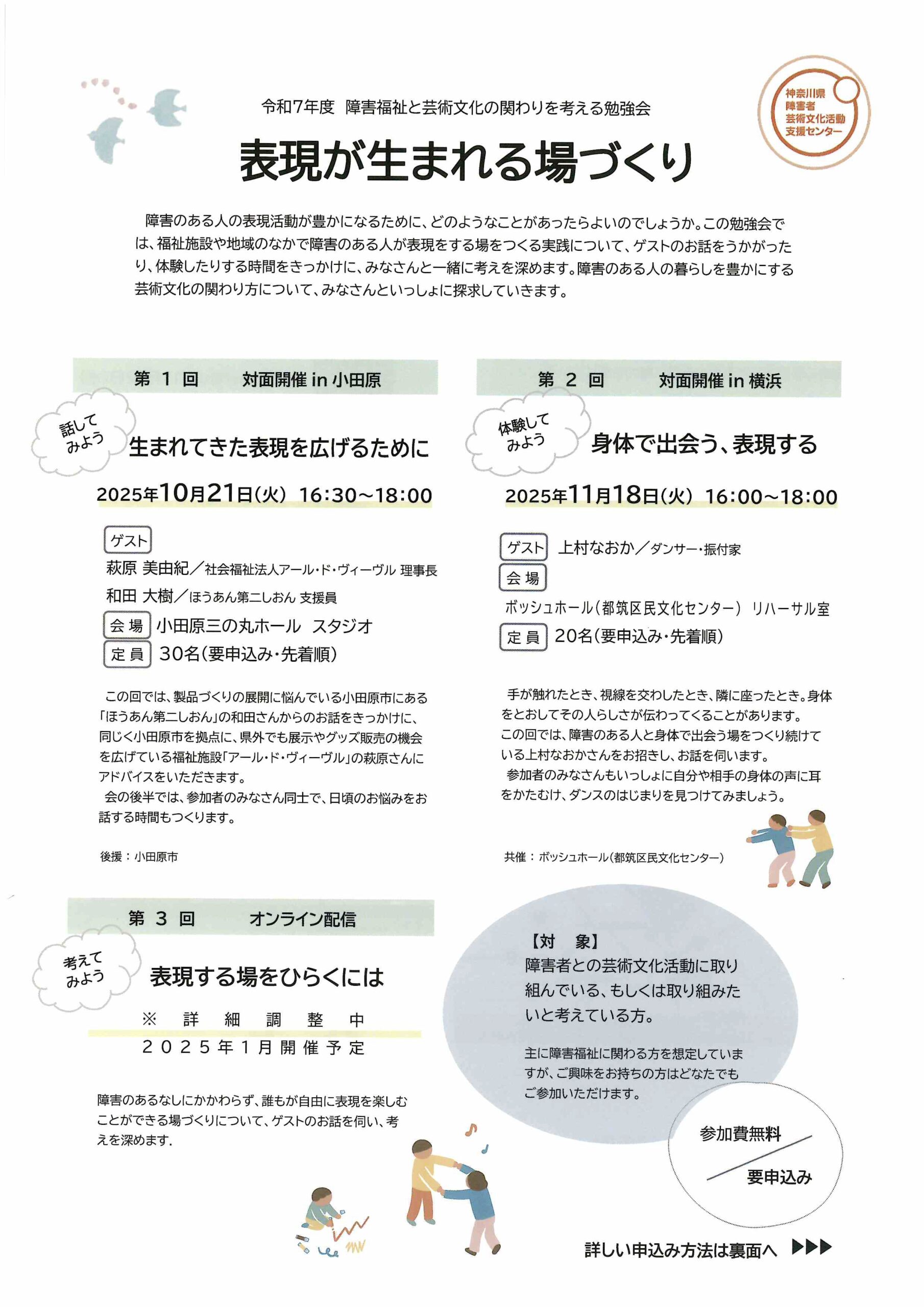 障害のある人の表現活動が豊かになるために、どのようなことがあったらよいのでしょうか。この勉強会では、福祉施設や地域のなかで障害のある人が表現をする場をつくる実践について、ゲストのお話をうかがったり、体験したりする時間をきっかけに、みなさんと一緒に考えを深めます。障害のある人の暮らしを豊かにする芸術文化の関わり方について、みなさんといっしょに探求していきます。