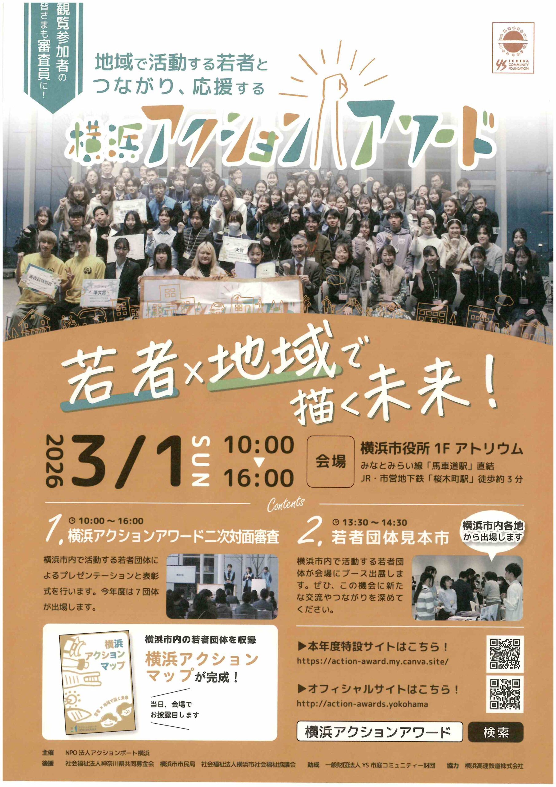 日時:2026年3月1日(日)10:00-16:00 会場:横浜市役所 アトリウム(横浜市中区本町6-50-10) PDF情報No.115240 若者のチャレンジにエールを送る一日。 皆さんの参加をお待ちしています!