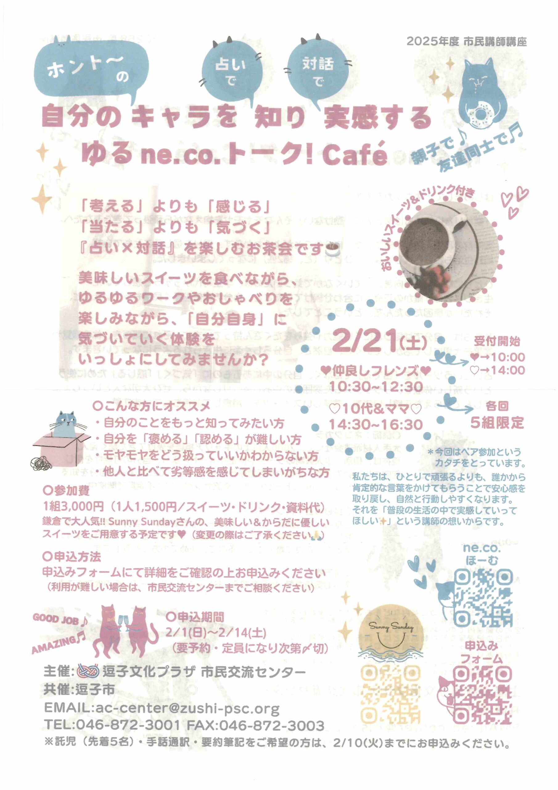 【開催日】2026年2月21日(土曜日) 【開催時間】 ・仲良しフレンズ 10時30分~12時30分 受付開始10時00分 ・10代&ママ 14時30分~16時30分 受付開始14時00分 【開催場所】逗子文化プラザ市民 […]
