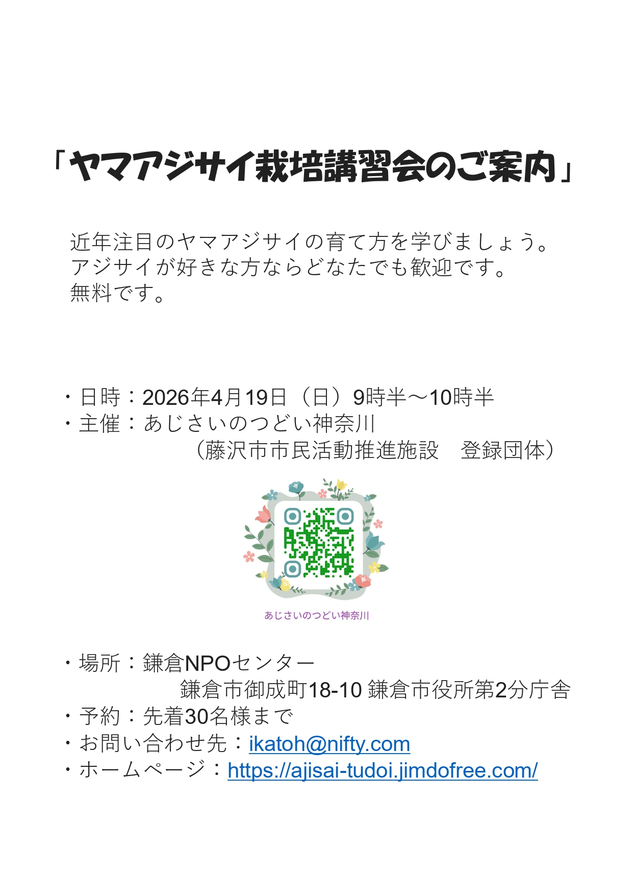 【日時】2026年4月19日(日)9時半~10時半 【場所】鎌倉NPOセンター 鎌倉市御成町18-10 鎌倉市役所第2分庁舎 【参加費】無料 PDF情報No.115491 近年注目のヤマアジサイの育て方を学びましょう。 […]
