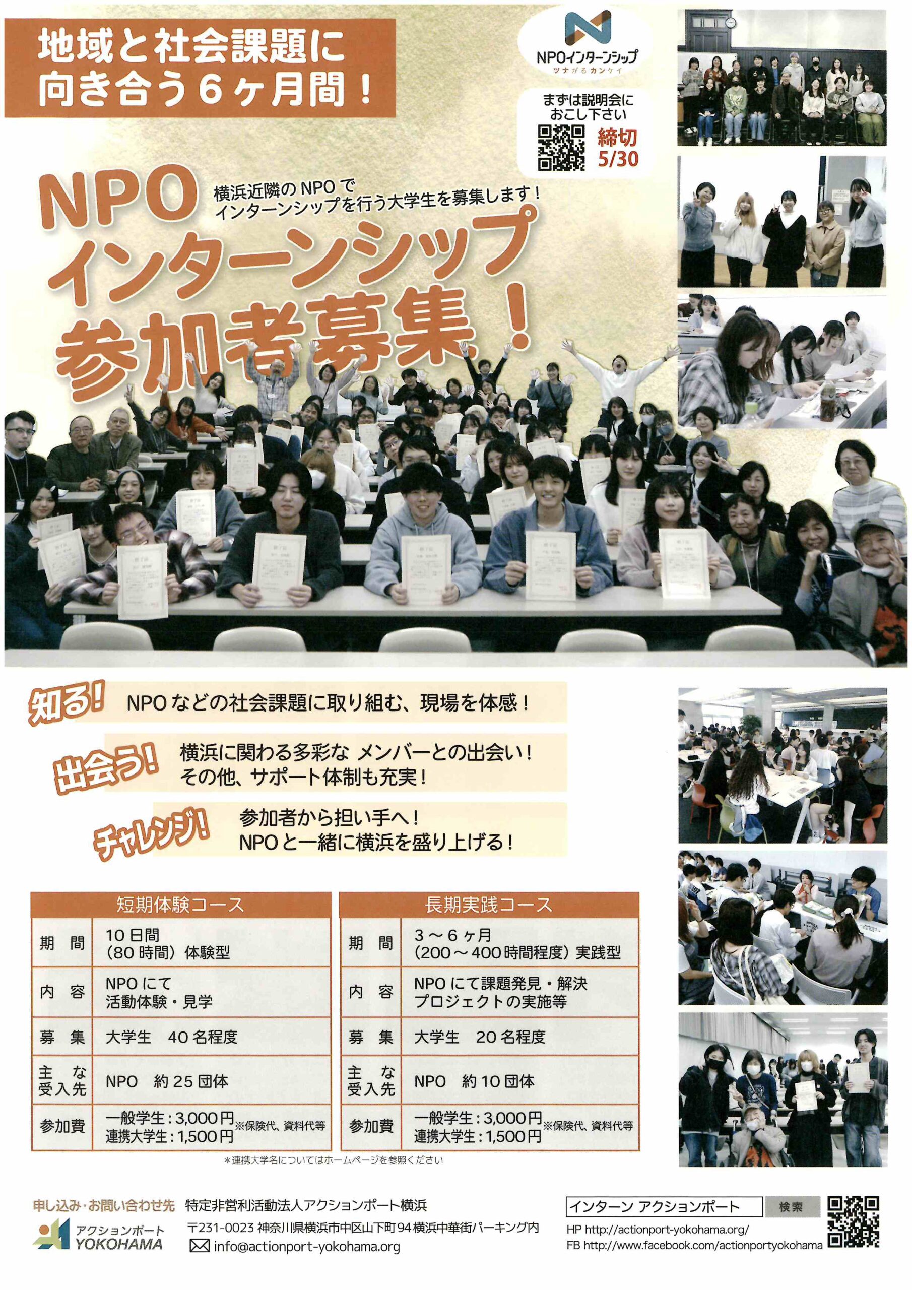 特定非営利活動法人 アクションポートYOKOHAMA 山下町94番地 横浜中華街パーキング協同組合内 横浜市中区 神奈川県説明会 【開催日】5月14日 短期体験コース 【期間】10日間(80時間) 【内容】NPOについて 活動体験・見学 【募集】大学生 約40名 【主な受入先】NPO 約25団体 【参加費】 一般学生:3000円 連携大学生 […]