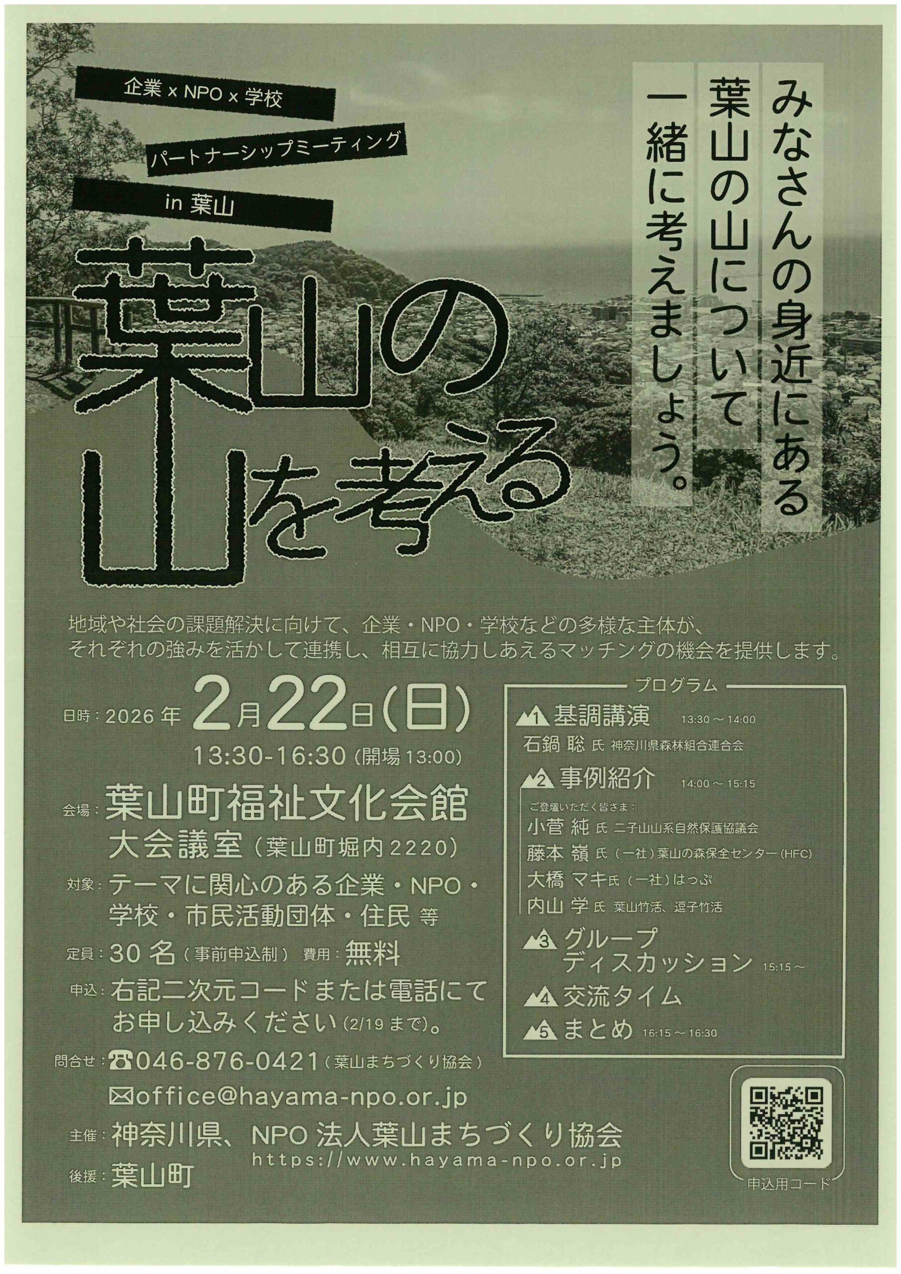 日時:2026年2月22日(日)13:30-16:30 (開場13:00) 場所:葉山町福祉文化会館大会議室(葉山町堀内2220) 定員:30名(事前申込制) 費用:無料 ※2月19日までにお申し込みください。 PDF情 […]