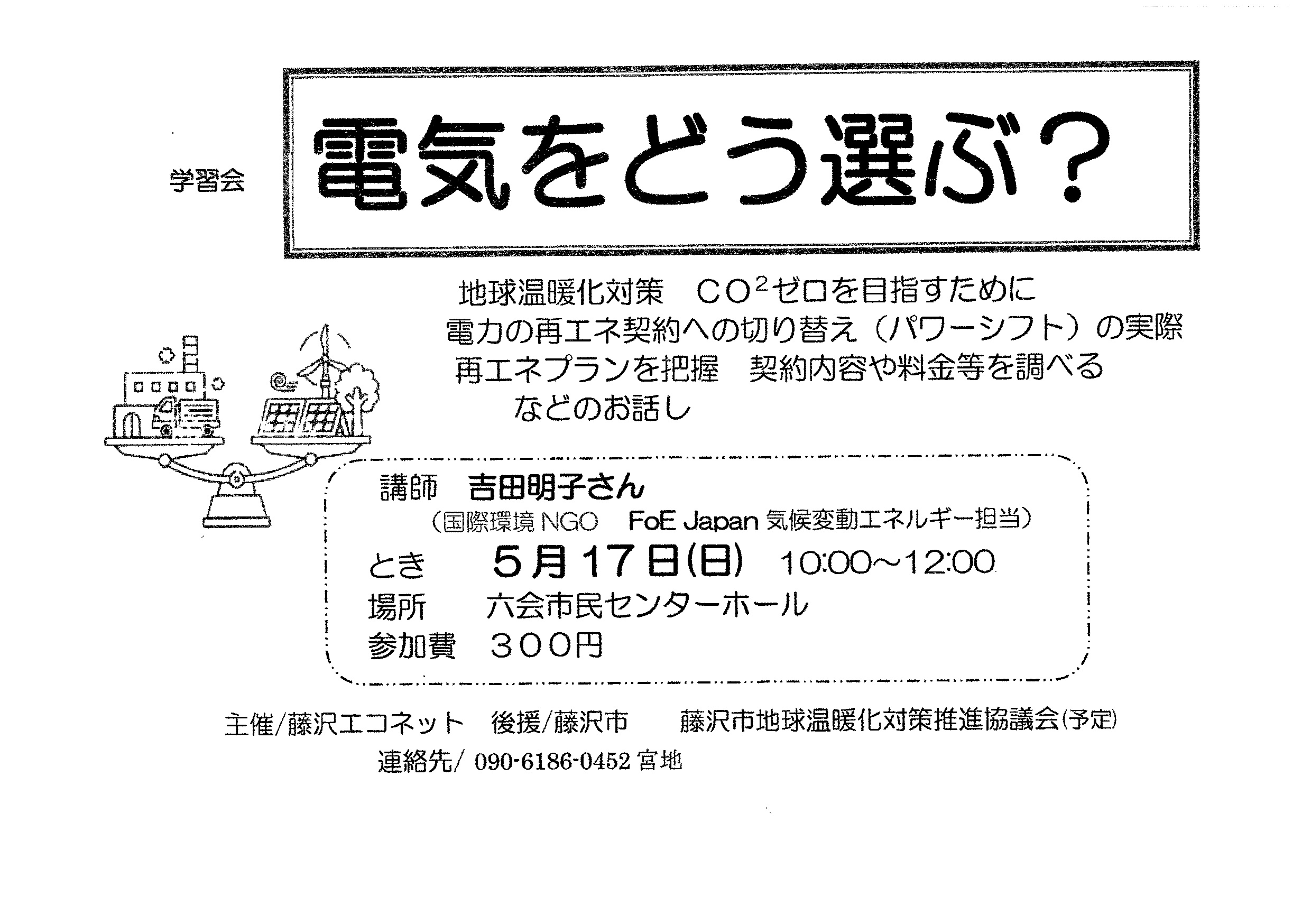 【日時】5月17日(日) 10:00~12:00 【場所】六会市民センターホール 【参加費】300円 PDF情報No.115514 地球温暖化対策CO2ゼロを目指すために 電力の再エネ契約への切り替え(パワーシフト)の実 […]