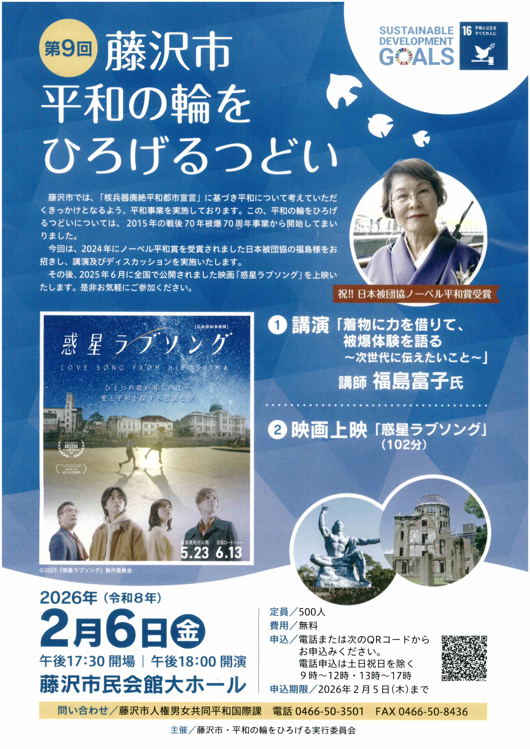 日時:2026年(令和8年)2月6日(金曜日)18時開演(17時30分開場) 費用:無料 申込期限:2月5日(木)まで PDF情報No.115205 今年で9回目を迎えます、平和の輪をひろげるつどいを開催します。 202 […]