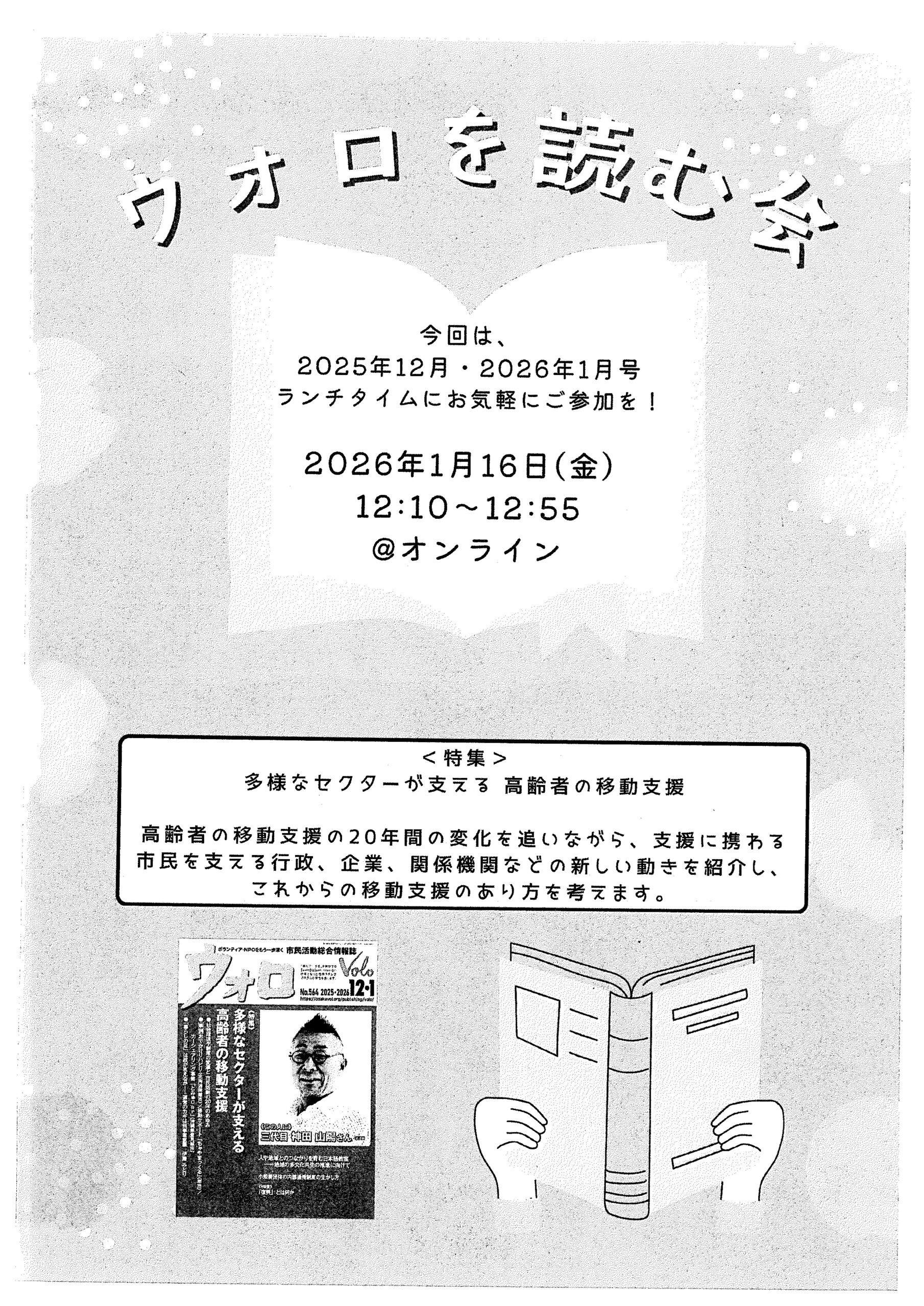 開催日時:2026年1月16日(金曜日)12時10分~12時55分 ※完全オンライン 参加費:ウォロ定期購読者、協会個人会員、パートナー登録団体は、無料。 上記以外の方は、2025年12・1月号をご購入ください(1冊65 […]