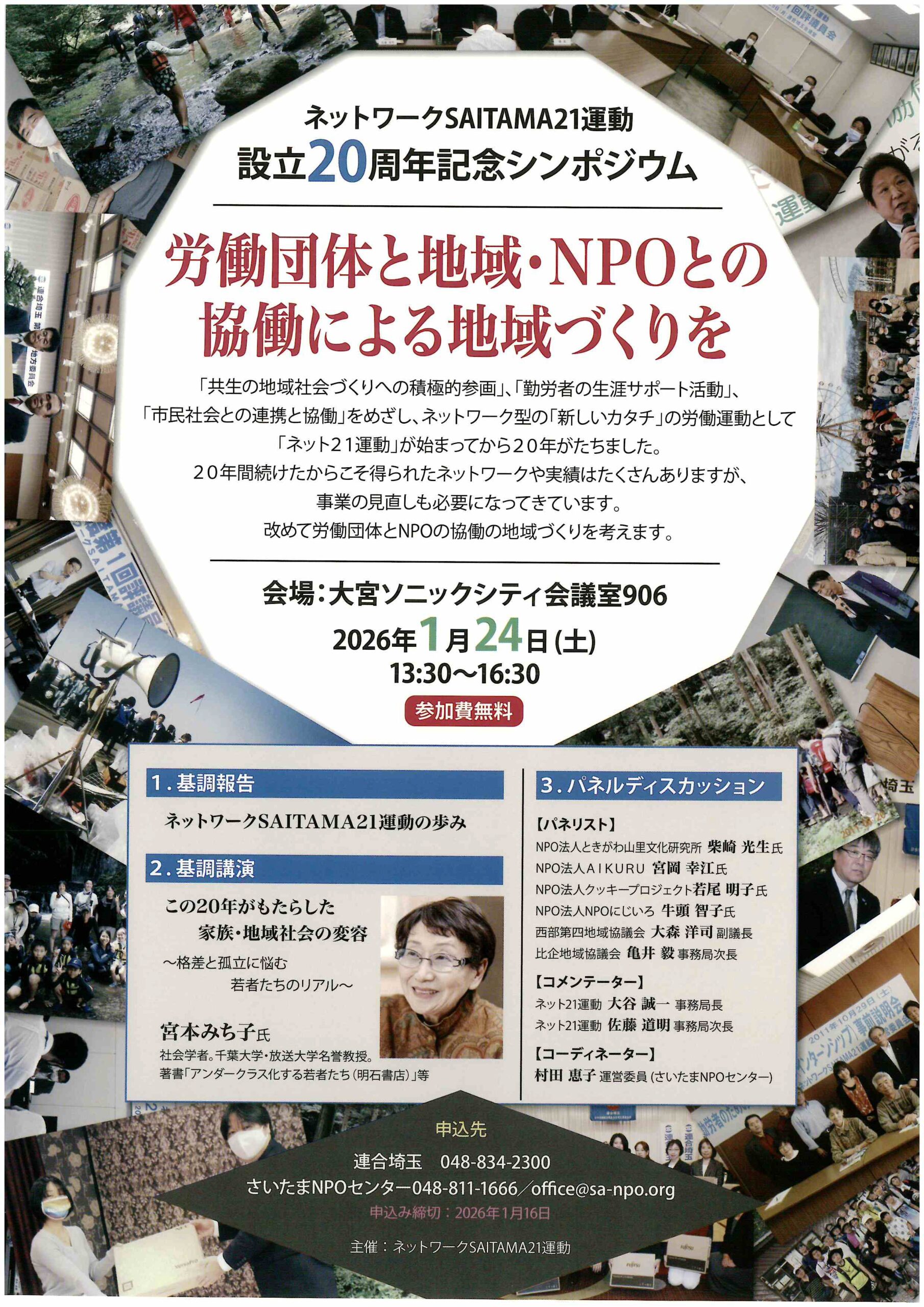 開催日時:2026年1月24日(土)13:30~16:30 会場:大宮宮ソニックシティ会議室906 参加費:無料 PDF情報No.115090 「共生の地域社会づくりへの積極的参画」、「勤労者の生涯サポート活動」、「市民 […]