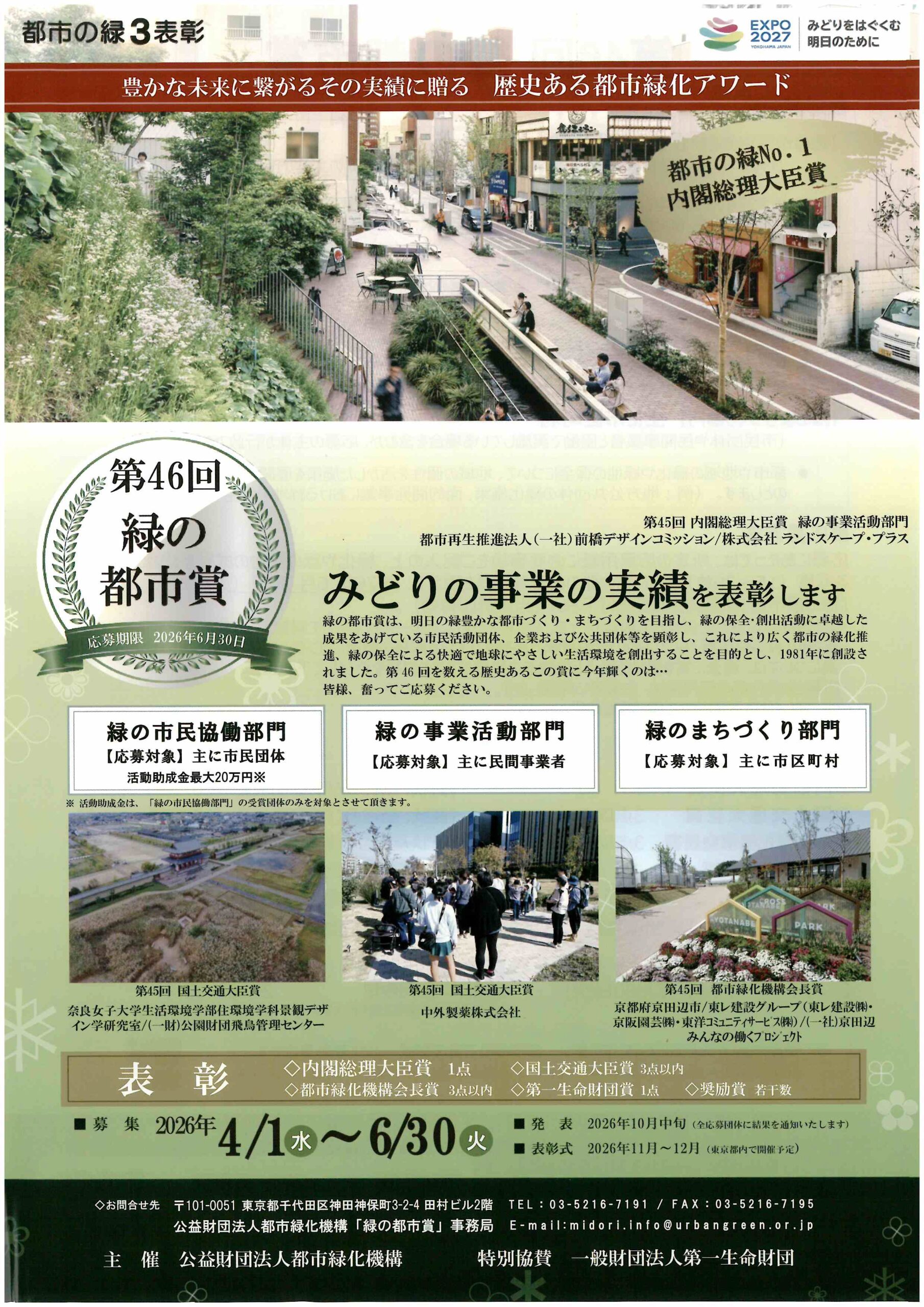 【申込期限】2026年4月1日~6月30日 【応募方法】「緑の都市賞」事務局宛へご送付 【発表日】2026年10月中旬 【表彰式】2026年12月 115505PDF情報No.115505 公益財団法人 都市緑化機構 緑 […]