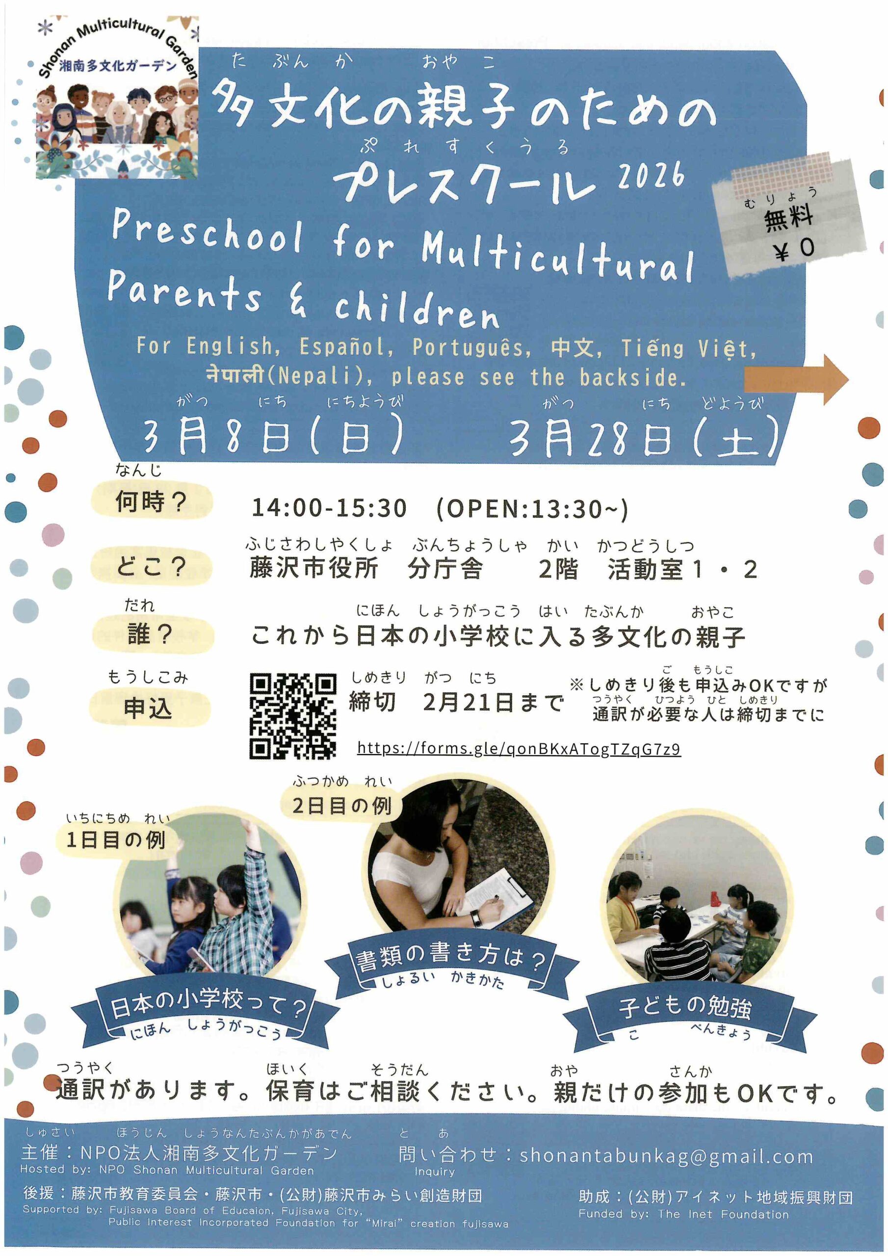 日付:3月8日(日) 3月28日(土) 何時?:14:00-15:30 (OPEN:13:30~) どこ?:藤沢市役所 分庁舎 2階 活動室1・2 誰?:これから日本の小学校に入る多文化の親子 申込:締切 2月21日まで […]