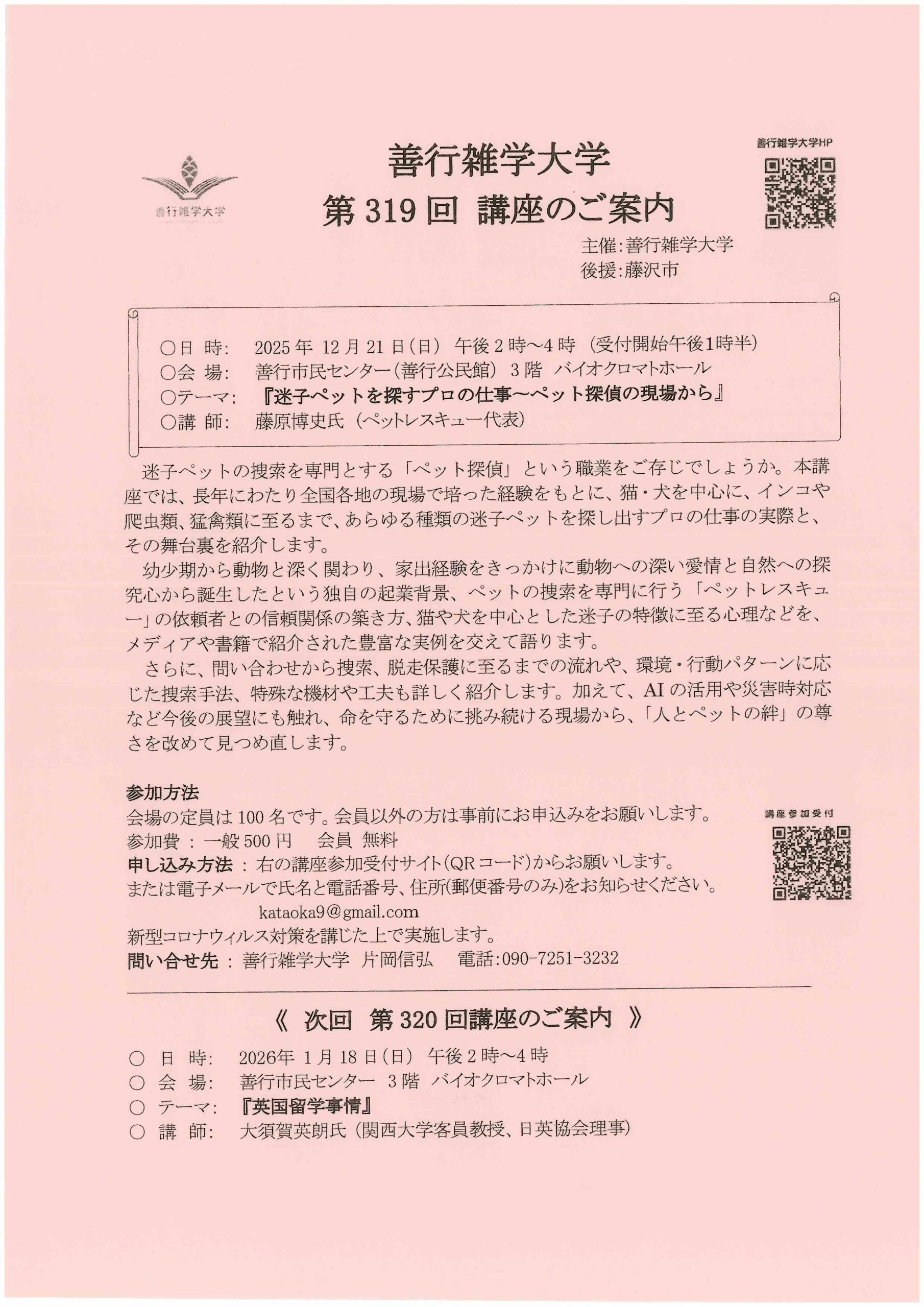 参加方法 会場の定員は100名です。会員以外の方は事前にお申込みをお願いします。 参加費: 一般500円 会員無料 PDF情報No.114700 迷子ペットの捜索を専門とする「ベット探偵」という職業をご存じでしょうか。本 […]