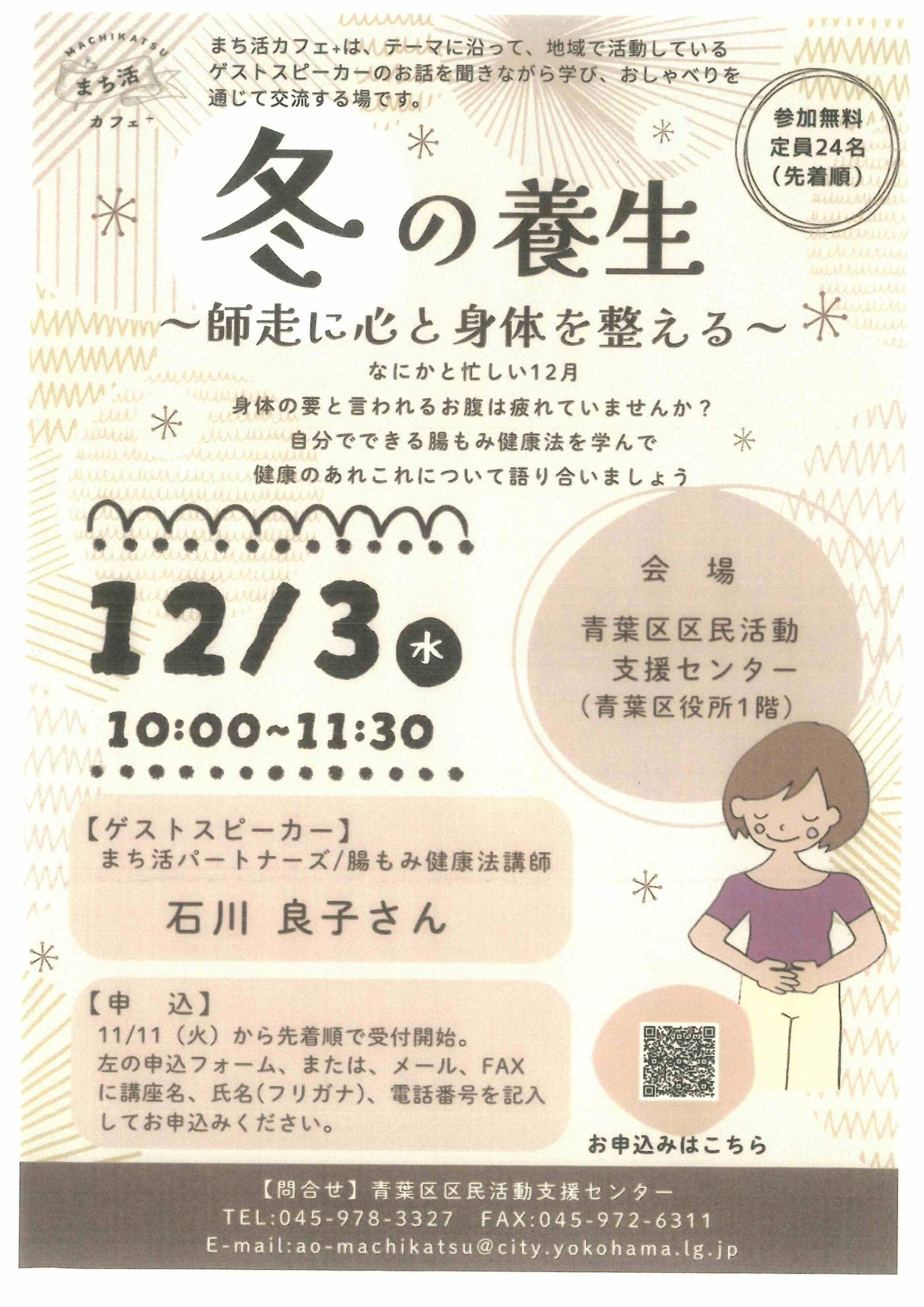 参加無料 申込:11/11(火)から先着順で受け付け開始 PDF情報No.1114746 なにかと忙しい12月 身体の要と言われるお腹は疲れていませんか? 自分でできる腸もみ健康法を学んで 健康のあれこれについて語り合い […]