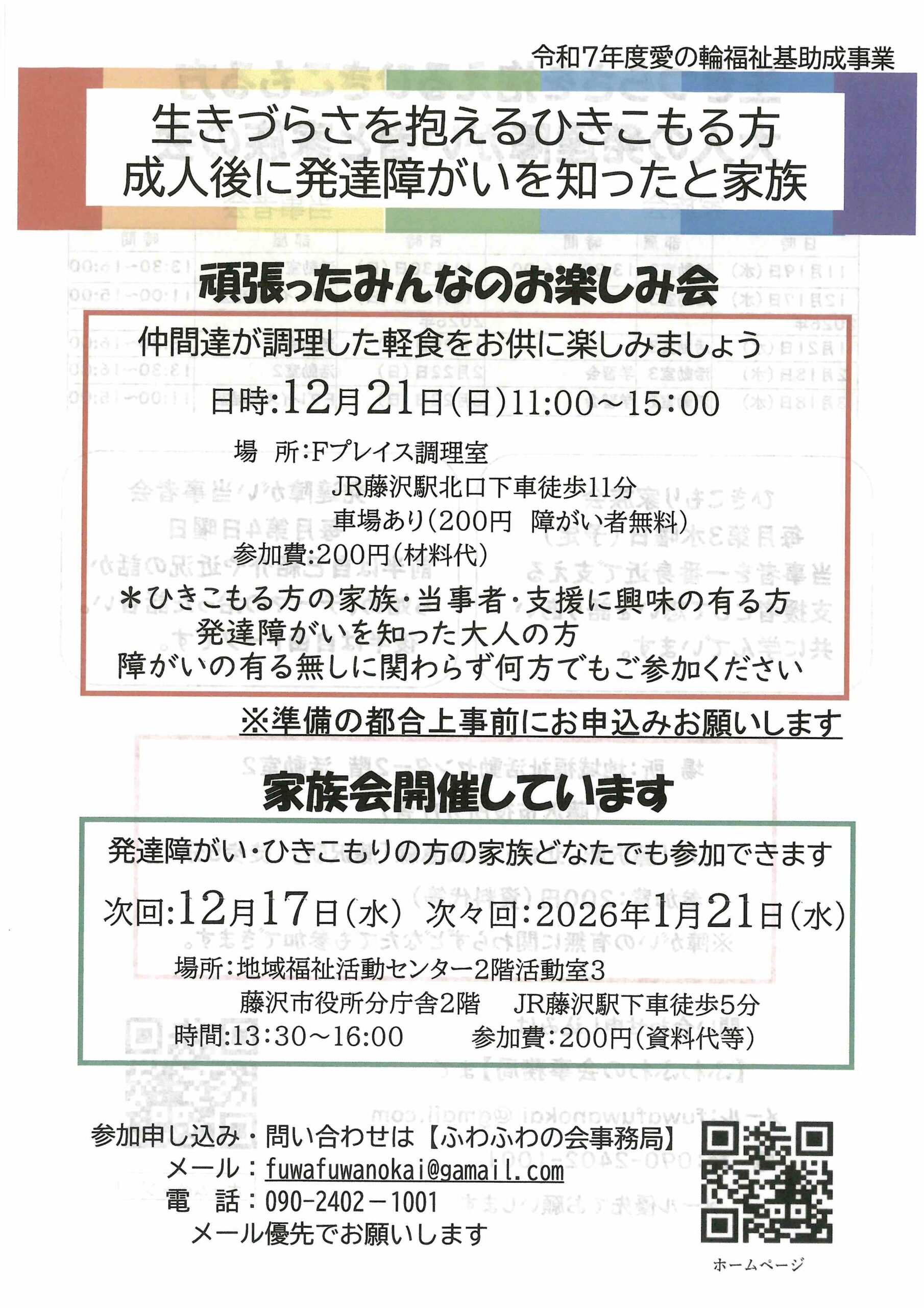 頑張ったみんなのお楽しみ会 仲間達が調理した軽食をお供に楽しみましょう 日時:12月21日(日) 11:00~15:00 場所:Fプレイス調理室 JR藤沢駅北口下車徒歩11分 車場あリ(200円障がい者無料) 参加費:2 […]