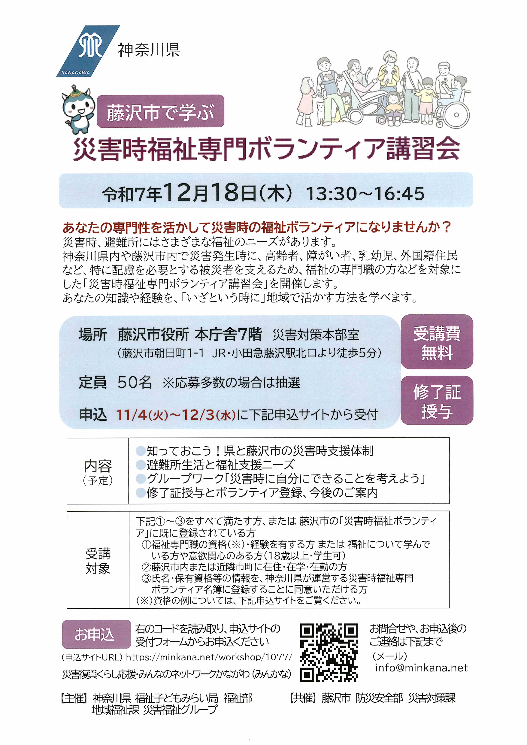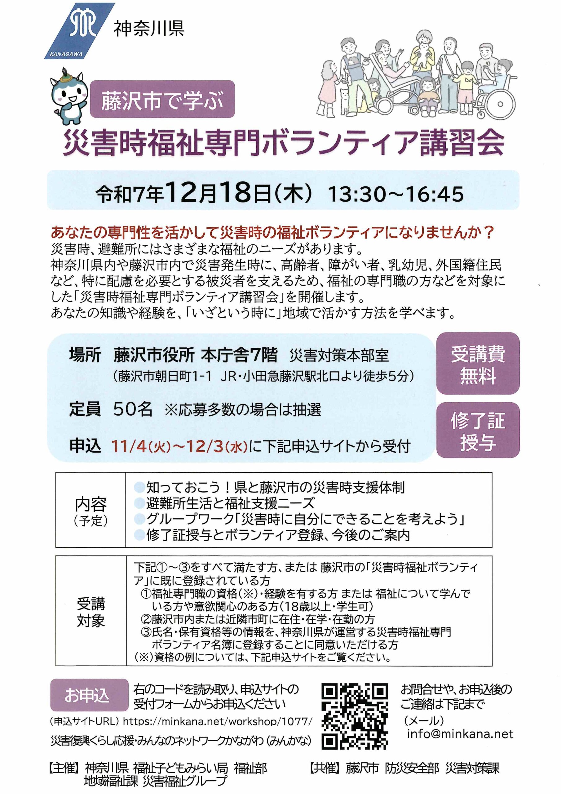 日時:令和7年12月18日(木) 13:30~16:45 場所:藤沢市役所本庁舎7階災害対策本部室 (藤沢市朝日町1-1 JR・小田急藤沢駅北口より徒歩5分) 定員:50名※応募多数の場合は抽選 申込:11/4(火)~1 […]