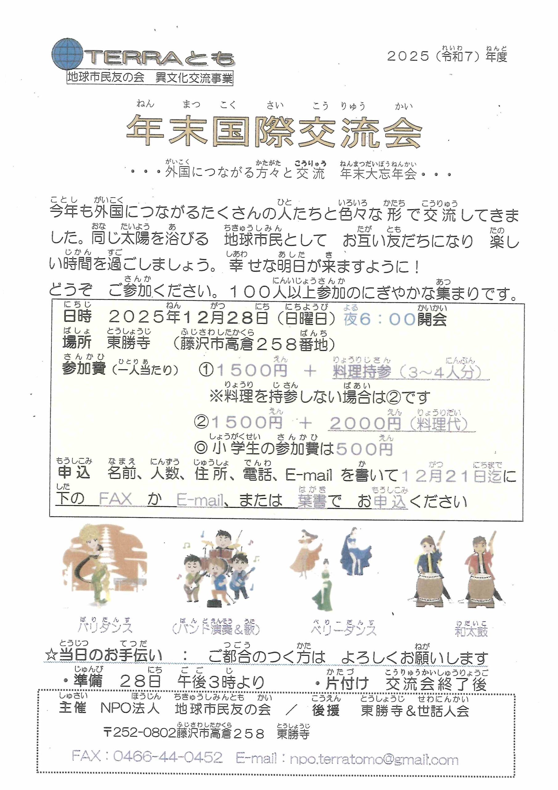 日時:2025年12月28日(日曜日)夜6:00開会 場所:東勝寺(藤沢市高倉258番地) 参加費(一人当たり):①1500円+料理持参(3~4人分)※料理を持参しない場合は②です ②1500円+2000円(料理代) ◎ […] |
