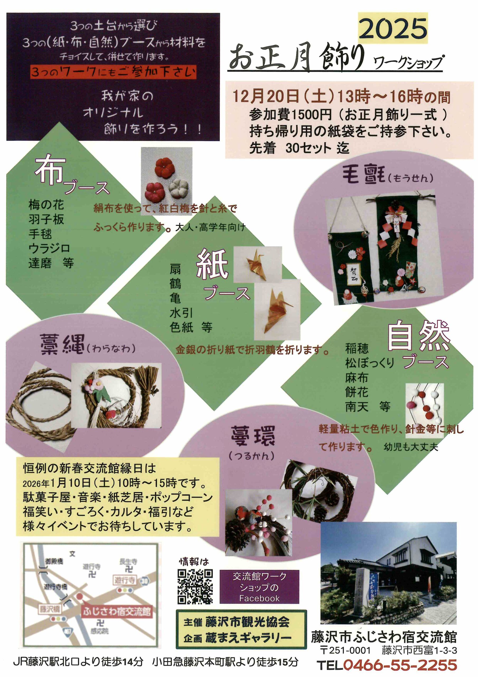 日時:12月20日(土)13時~16時の間 参加費:1500円(お正月飾り一式)持ち帰り用の紙袋をご持参下さい。先着30セット迄 PDF情報No.114830 3つの土台から選び3つの(紙・布・自然)ブースから材料をチョ […]