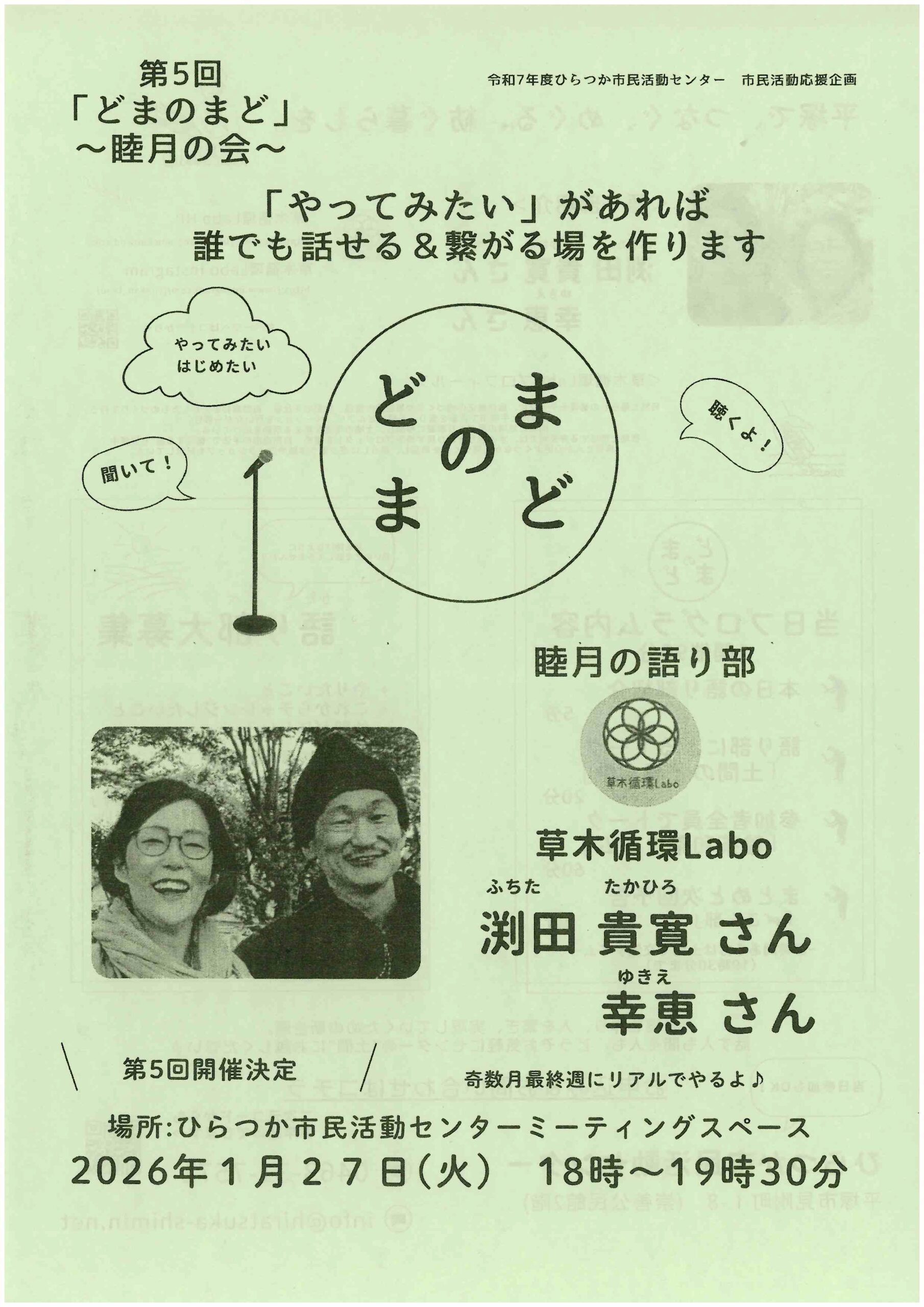 日時:2026 年1月31 日(土)14:00-16:30 場所:プラッツ5階 団体活動スペース 参加費:無料 備考:パネル展示したい場合は、12月25日までに申し込みをして下さい PDF情報No.115046 顔見知 […]