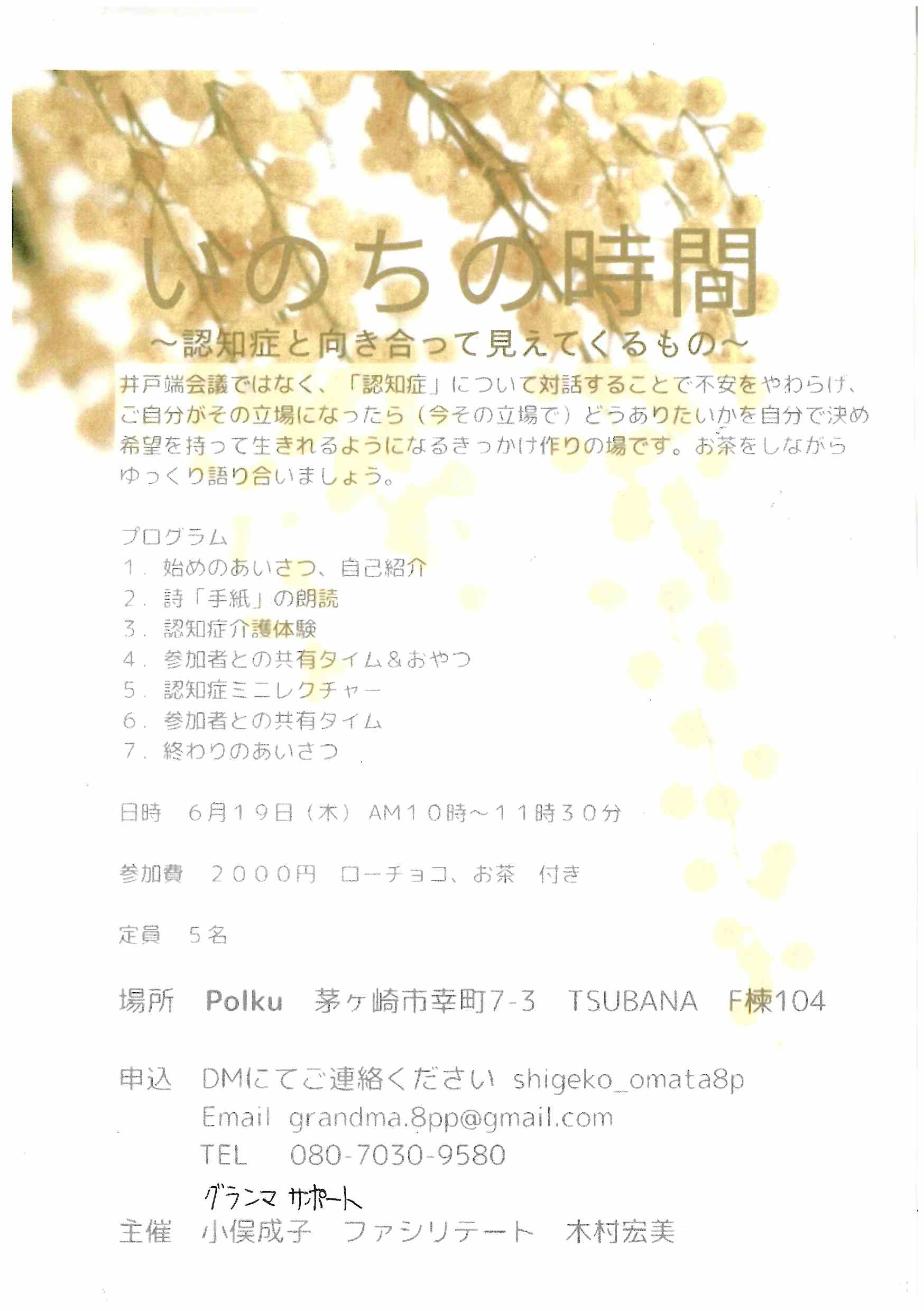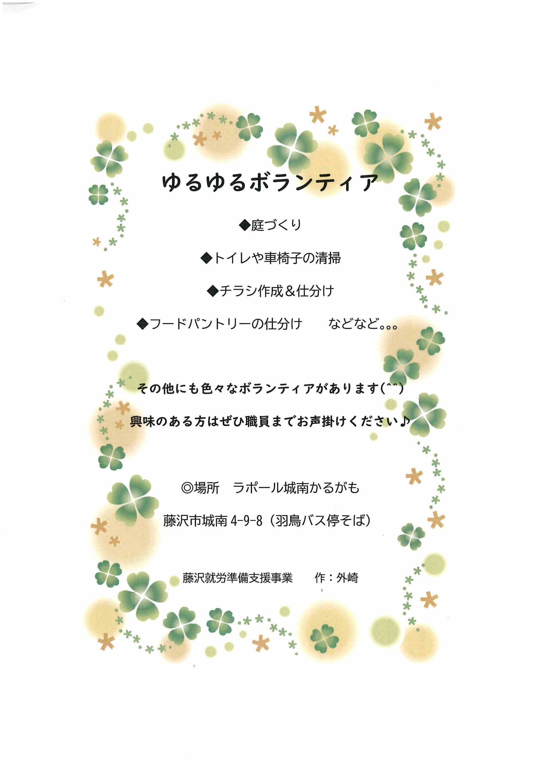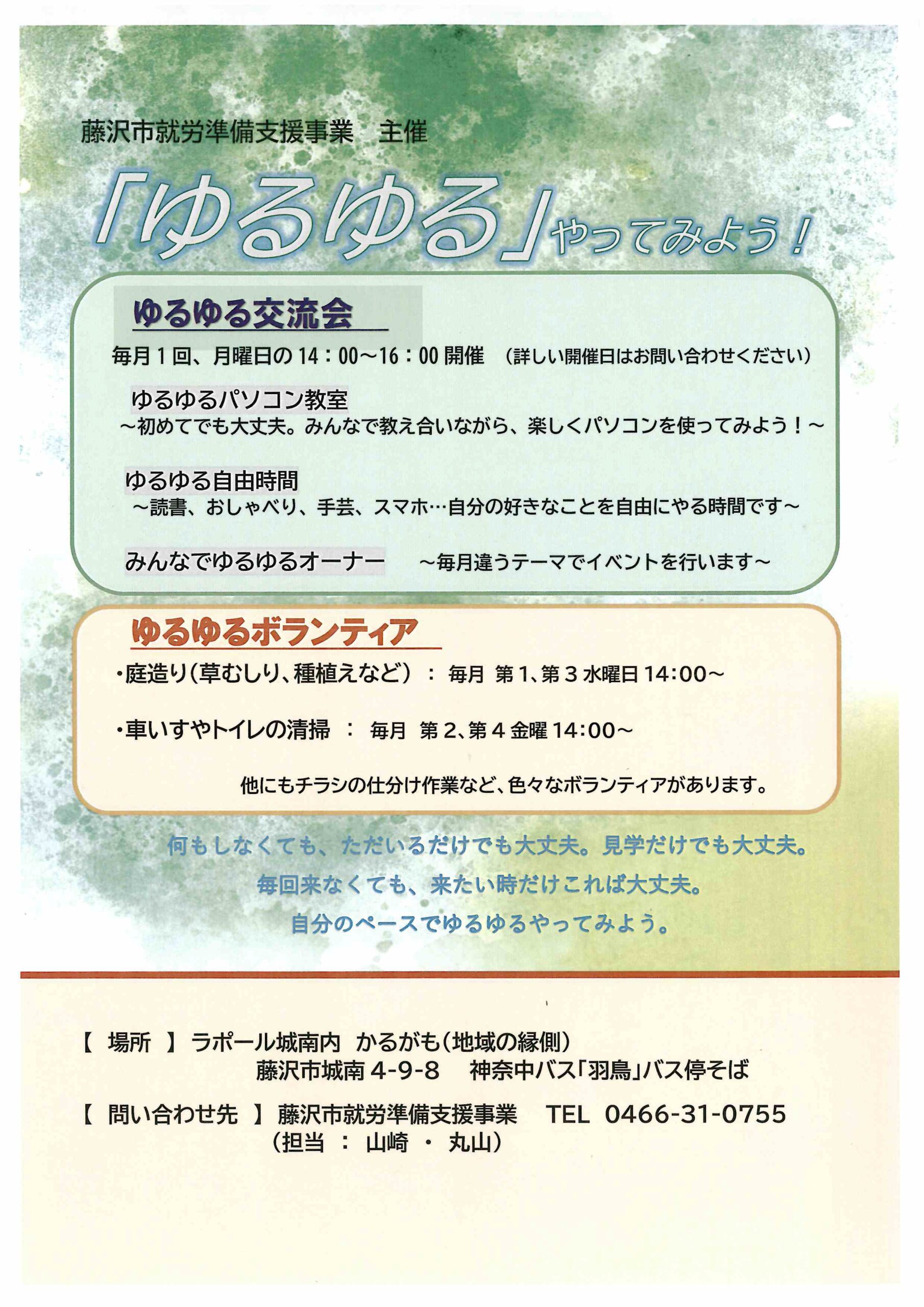 ゆるゆる交流会 毎月1回、月曜日の14:00~16:00開催 ゆるゆるボランティア ・庭造り(草むしり、種植えなど):毎月第1、第3水曜日14:00~ ・車いすやトイレの清掃:毎月第2、第4金曜14:00~ PDF情報N […] |