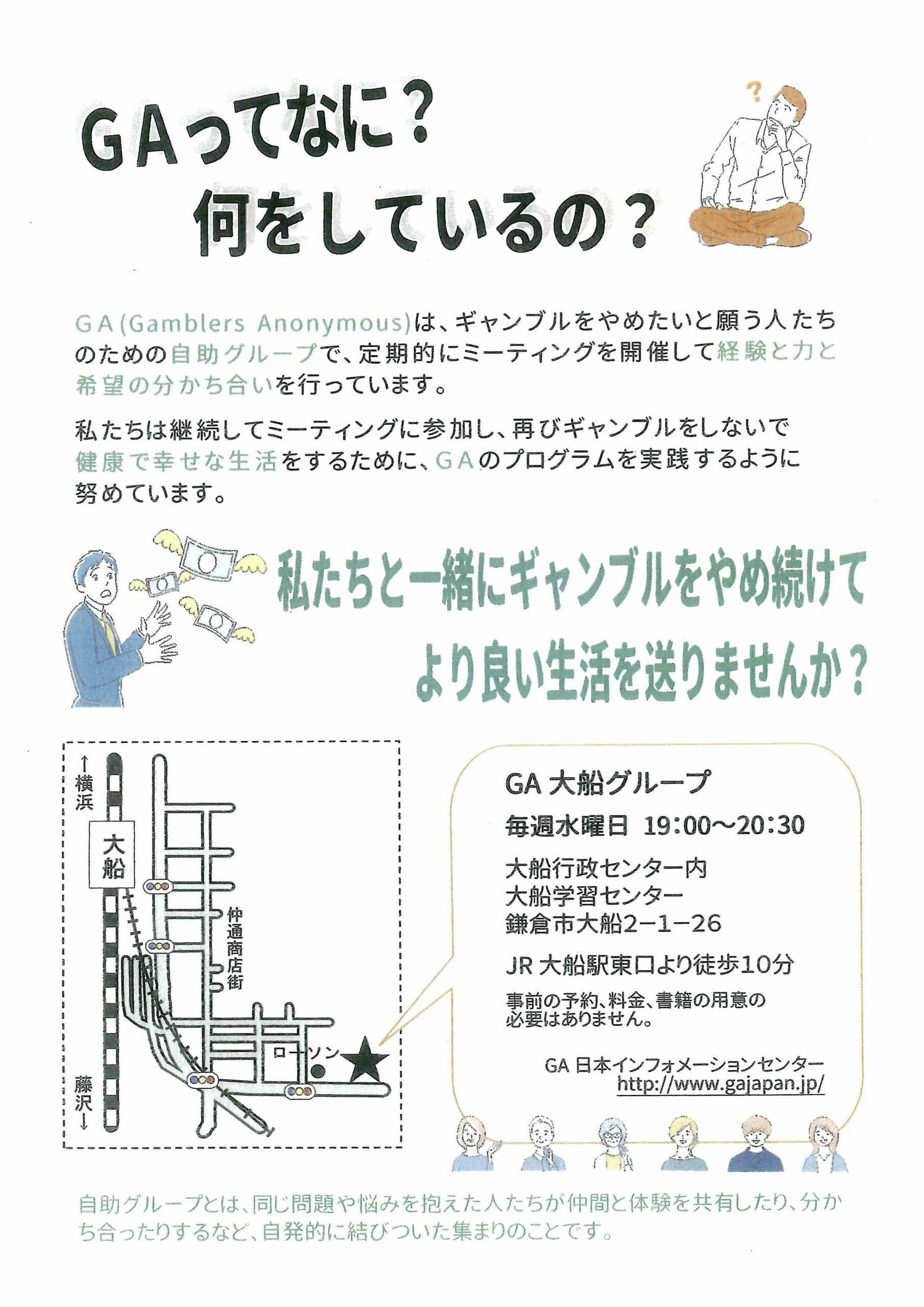 GA大船グループ 毎週水曜日19:00~20:30 PDF情報No.113909 GA (Gamblers Anonymous)は、ギャンブルをやめたいと願う人たちのための自助グループで、定期的にミーティングを開催して経 […]