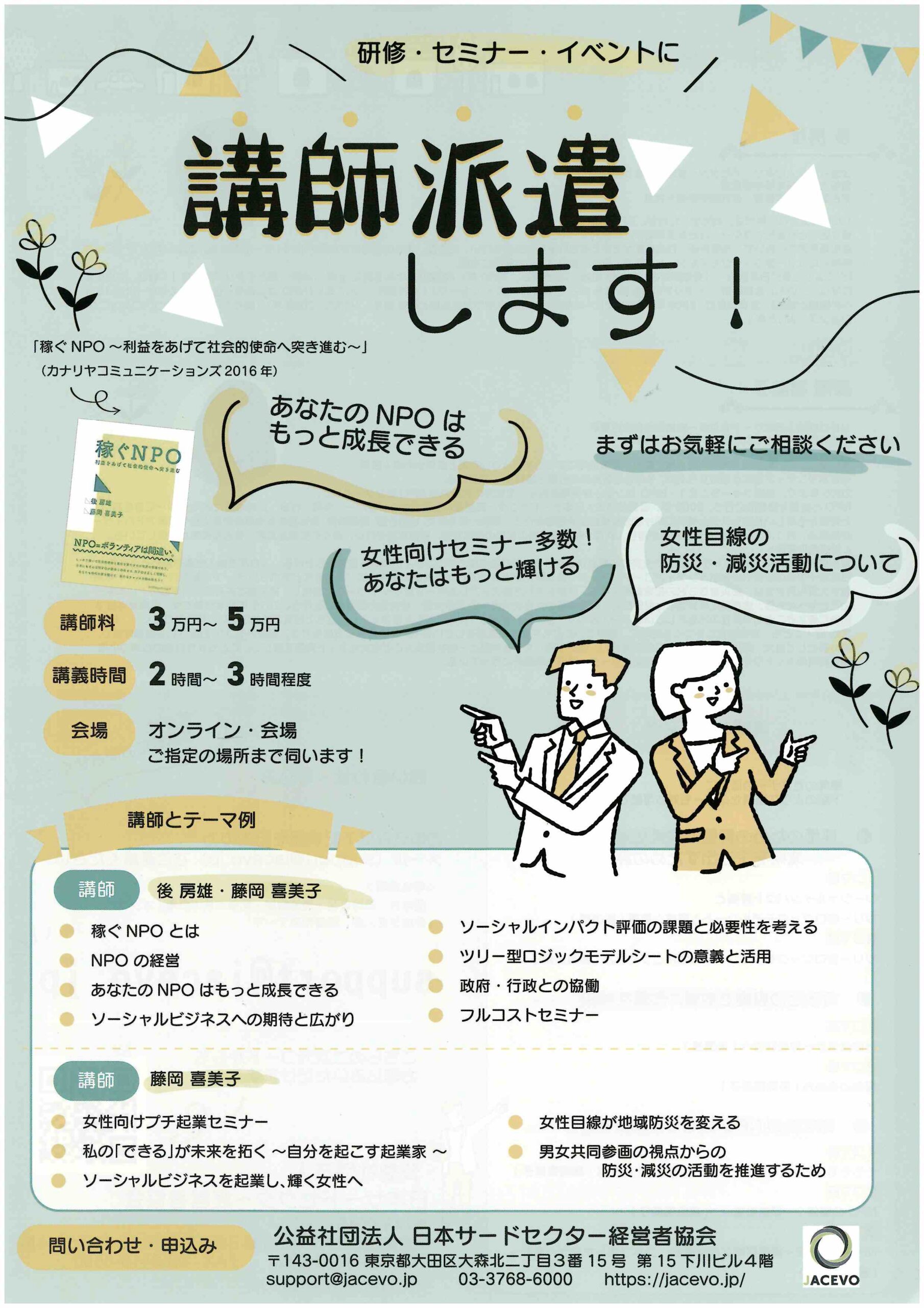 NPO運営力向上セミナー 第1回 法務・労務 7/1(火)15:00-16:30 第2回 マネジメント 7/15(火)15:00-16:30 第3回 経理事務 7/29(火)15:00-16:30 認定NPO取得のため […]