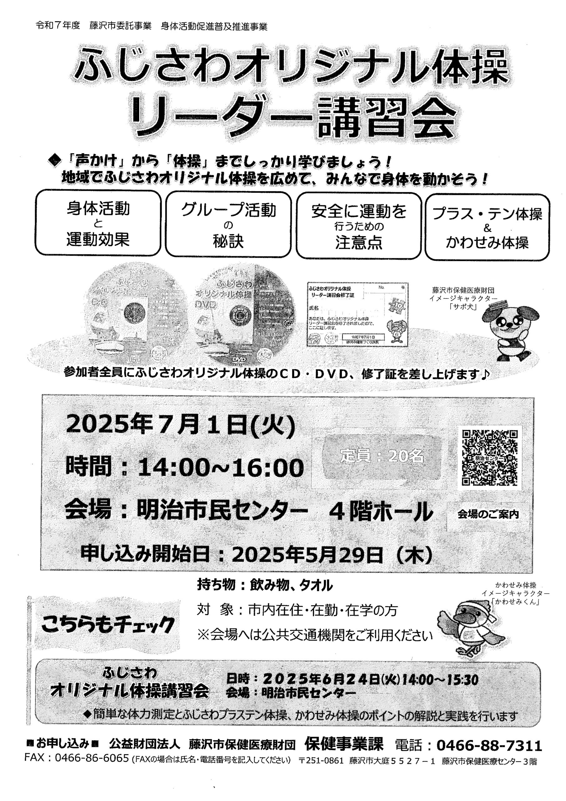 申し込み開始日:2025年5月29日(木) PDF情報No.113905 ◆「声かけ」から「体操」までしっかり学びましょう! 地域でふじさわオリジナル体操を広めて、みんなで身体を動かそう!
