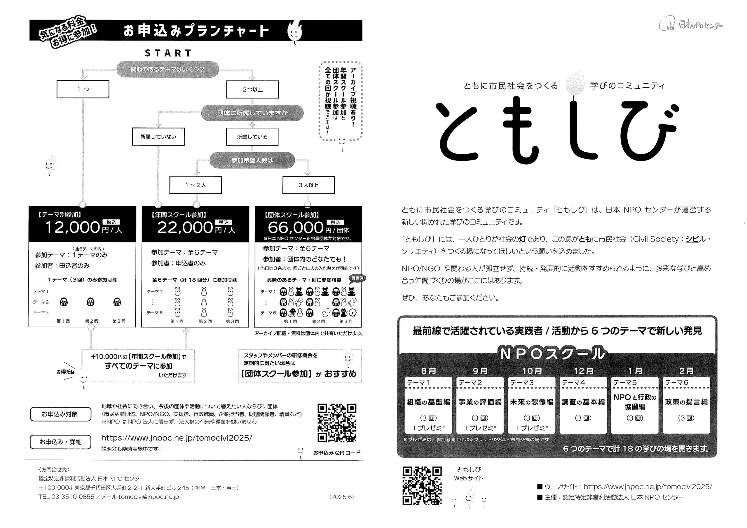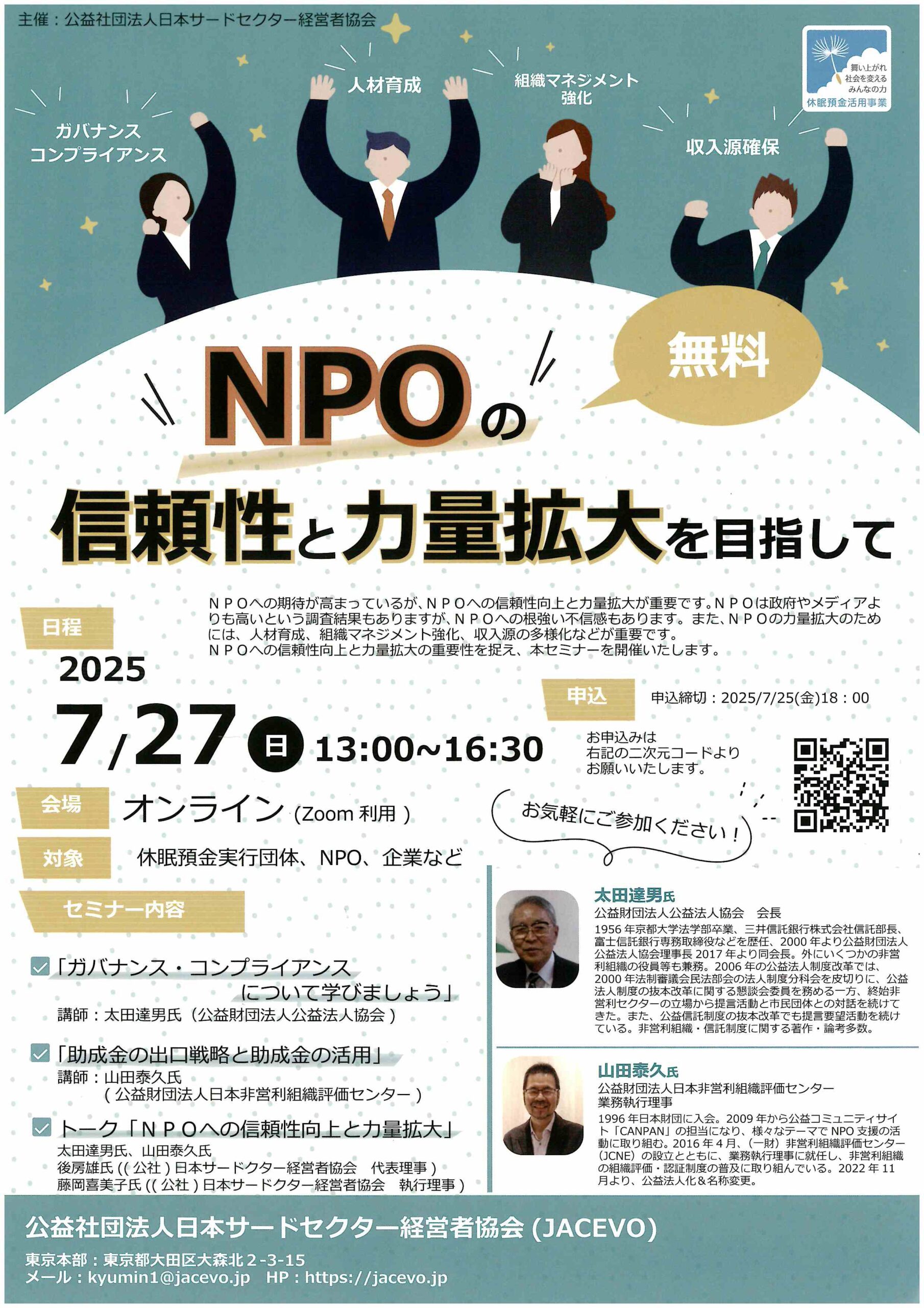 NPO運営力向上セミナー 第1回 法務・労務 7/1(火)15:00-16:30 第2回 マネジメント 7/15(火)15:00-16:30 第3回 経理事務 7/29(火)15:00-16:30 認定NPO取得のため […]