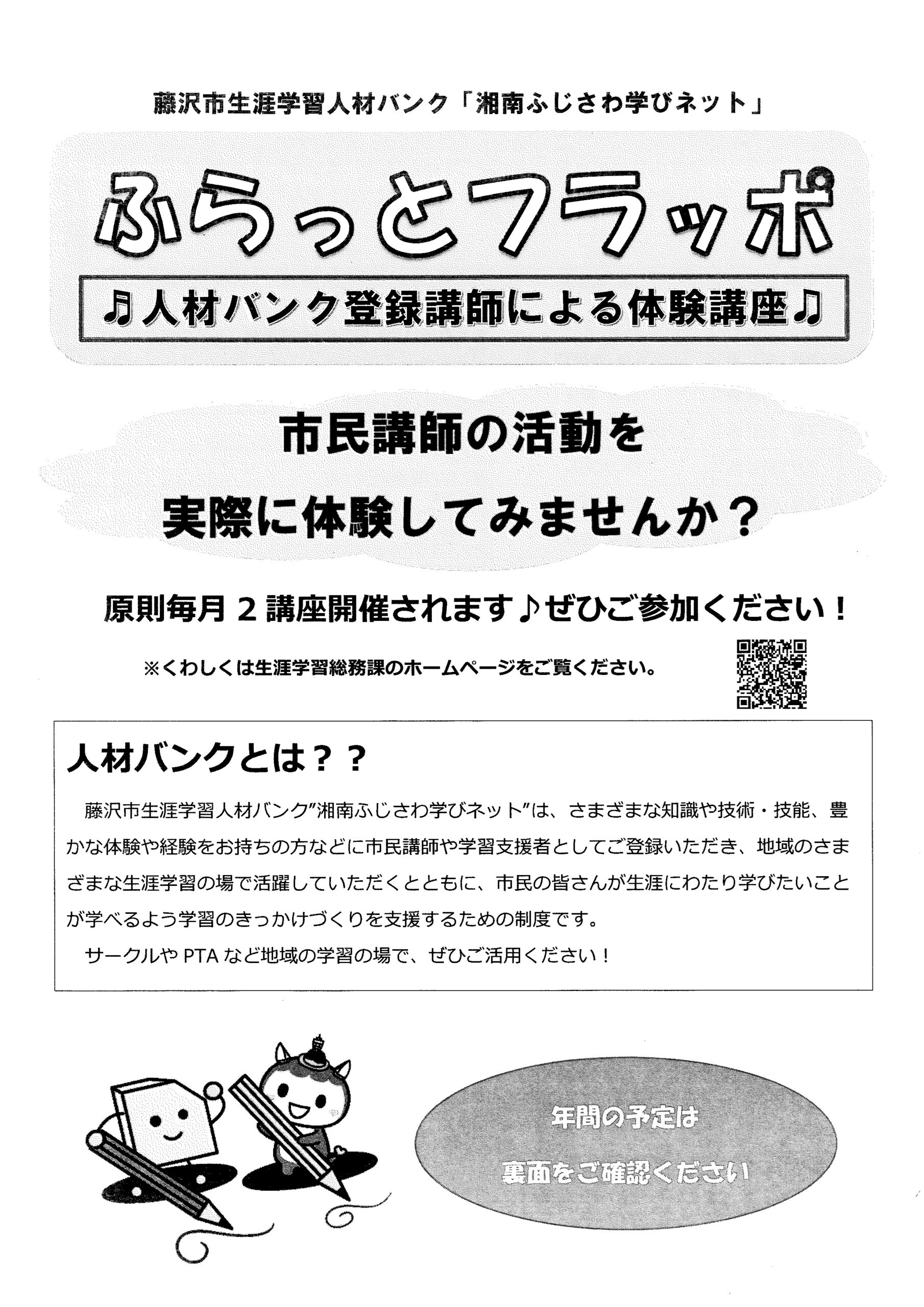 原則毎月2講座開催されます♪ぜひご参加ください! 開催時間:午前10時00分から11時00分(全講座、開催時間は同じです。) PDF情報No.113880 市民講師の活動を実際に体験してみませんか? |