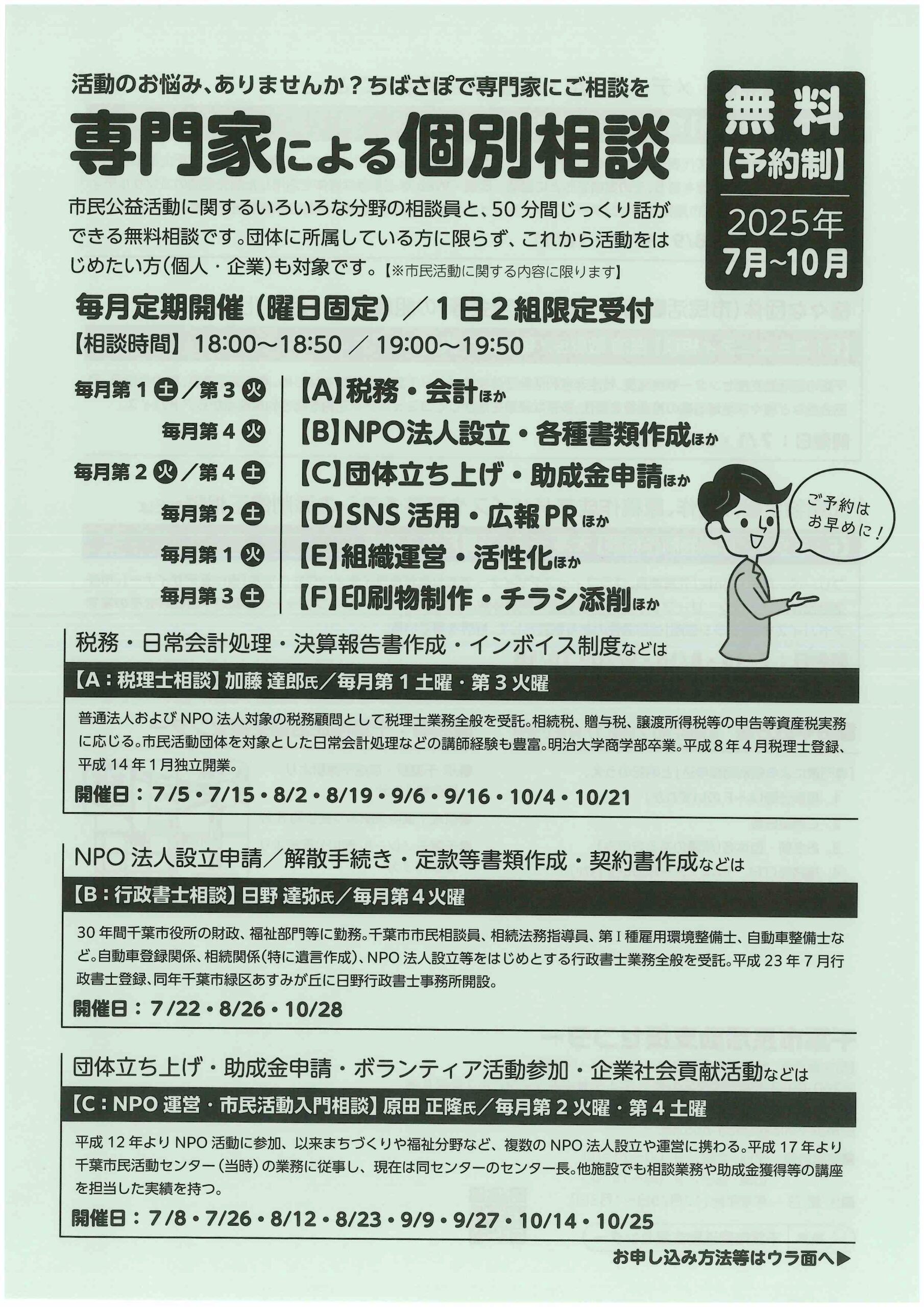 ◆相談分野(全6種)と7月~9月の開催日 ○税理士 内 容:市民活動団体の税務会計、NPO法人の決算など 相談員:加藤達郎さん 開催日:7/5、7/15、8/2、8/19、9/6、9/16 ○行政書士 内 容:NPO法人 […]