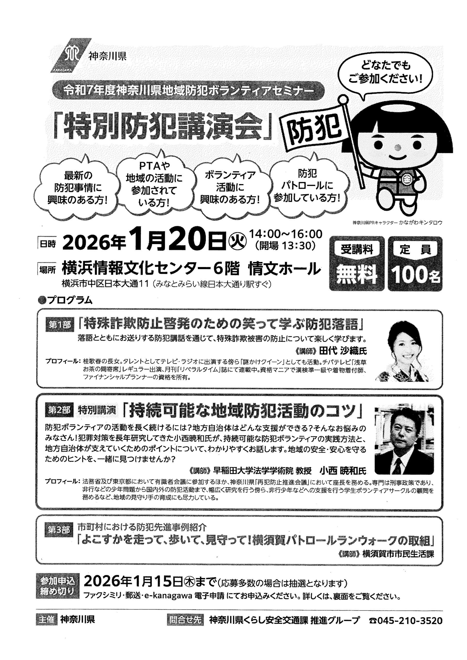 受講料:無料 参加申込締め切り:2026年1月15日(木)まで PDF情報No.114626 地域防犯ボランティア活動を行っている方やこれから新たに開始したい方、防犯の知識を高めたい方などを対象に、特殊詐欺被害防止や防犯 […]
