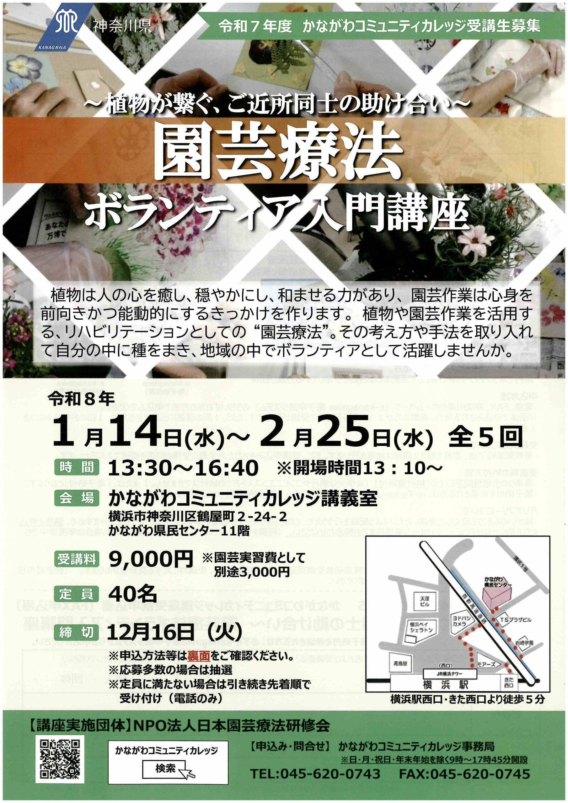 実施日:1月14日、21日、2月4日、18日、25日(全水曜)全5回 時間:13時30分から16時40分 申込締切日 :12月16日(火曜) 受講料:9,000円 (園芸実習材料費として3,000円別途徴収) PDF情報 […]