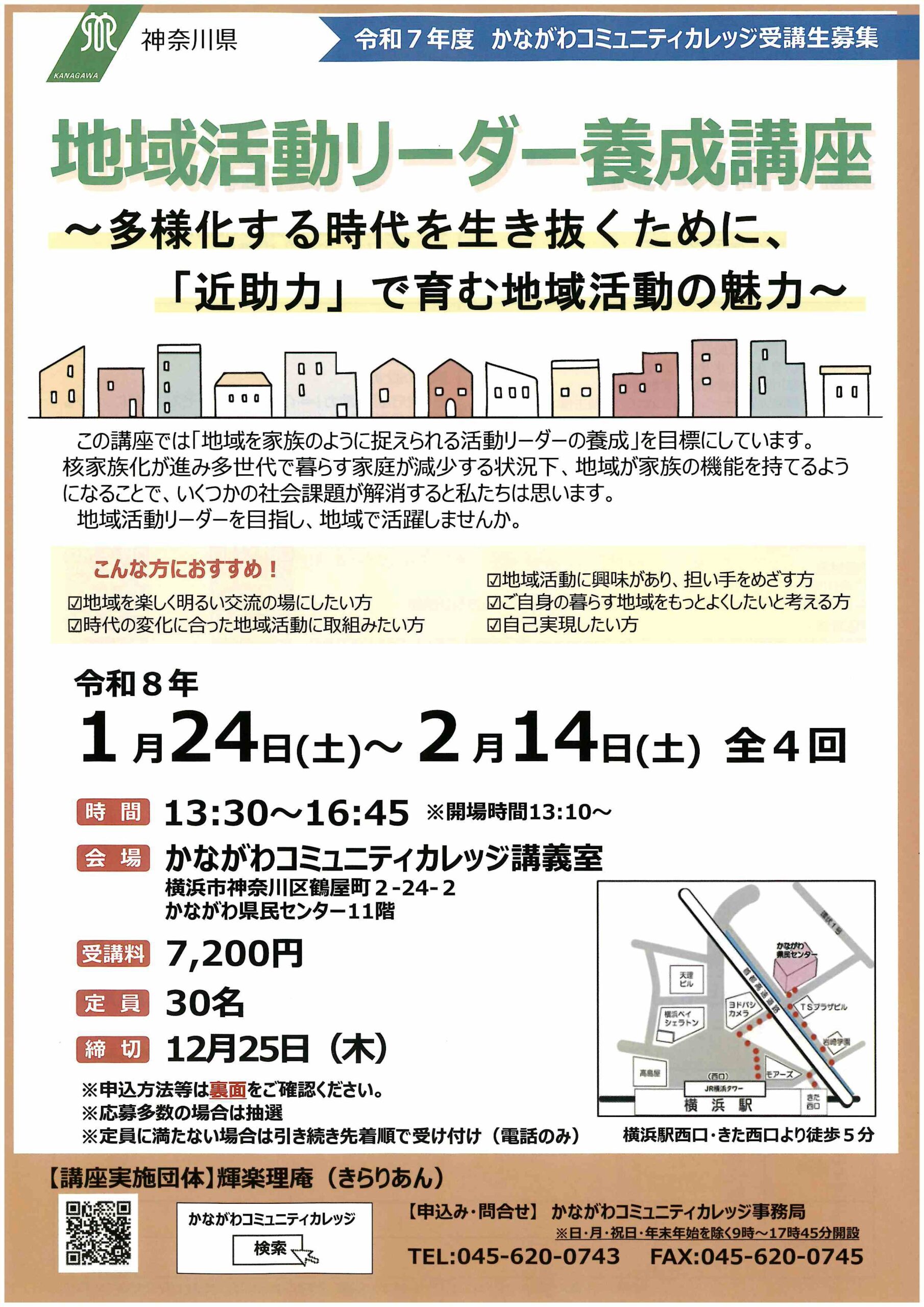 実施日:1月24日、31日、2月7日、14日(全土曜)全4回 時間:13時30分から16時45分 申込締切日:12月25日(木曜) 受講料:7,200円 PDF情報No.114735 この講座では「地域を家族のように捉え […]