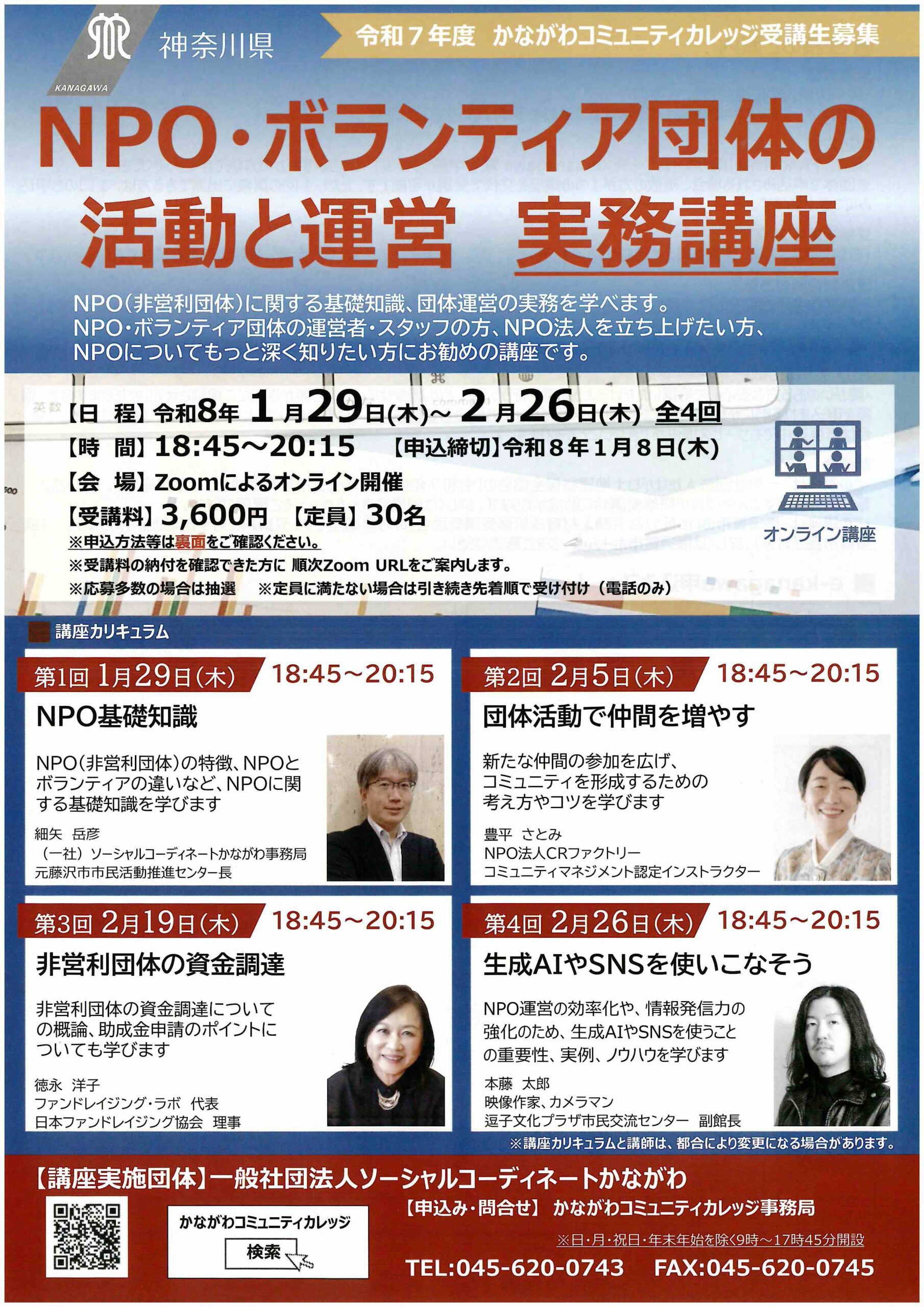 実施日:1月29日、2月5日、19日、26日(全木曜)全4回 時間:18時45分から20時15分 申込締切日:1月8日(木曜) 受講料:3,600円 PDF情報No.114736 NPO(非営利団体)に関する基礎知識、団 […]