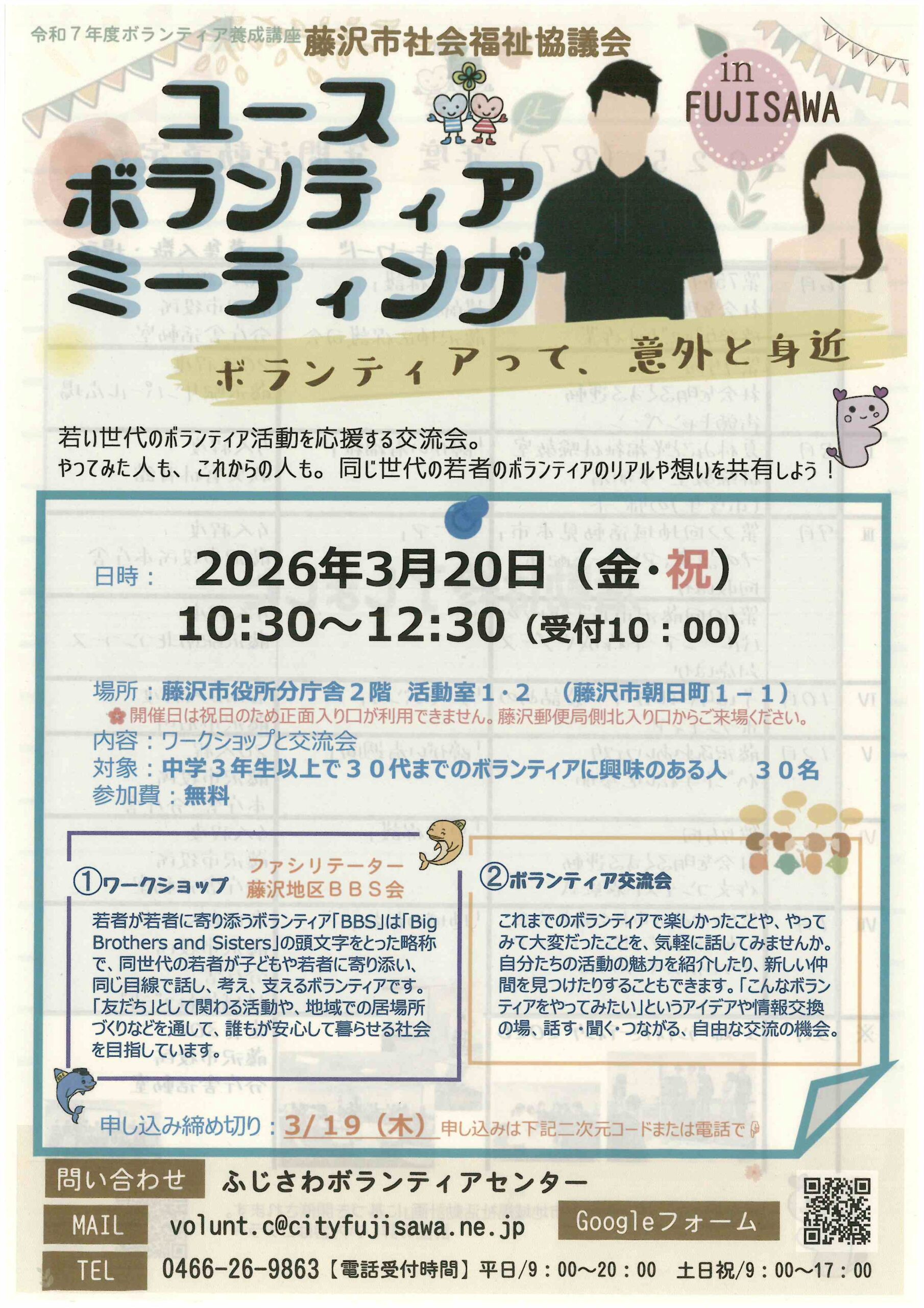 【日時】2026年3月20日(金・祝) 10:30~12:30(受付10:00) 【参加費】無料 【申込締切】3月19日(木) PDF情報No.115257 若い世代のボランティア活動を応援する交流会。 やってみた人も、 […]