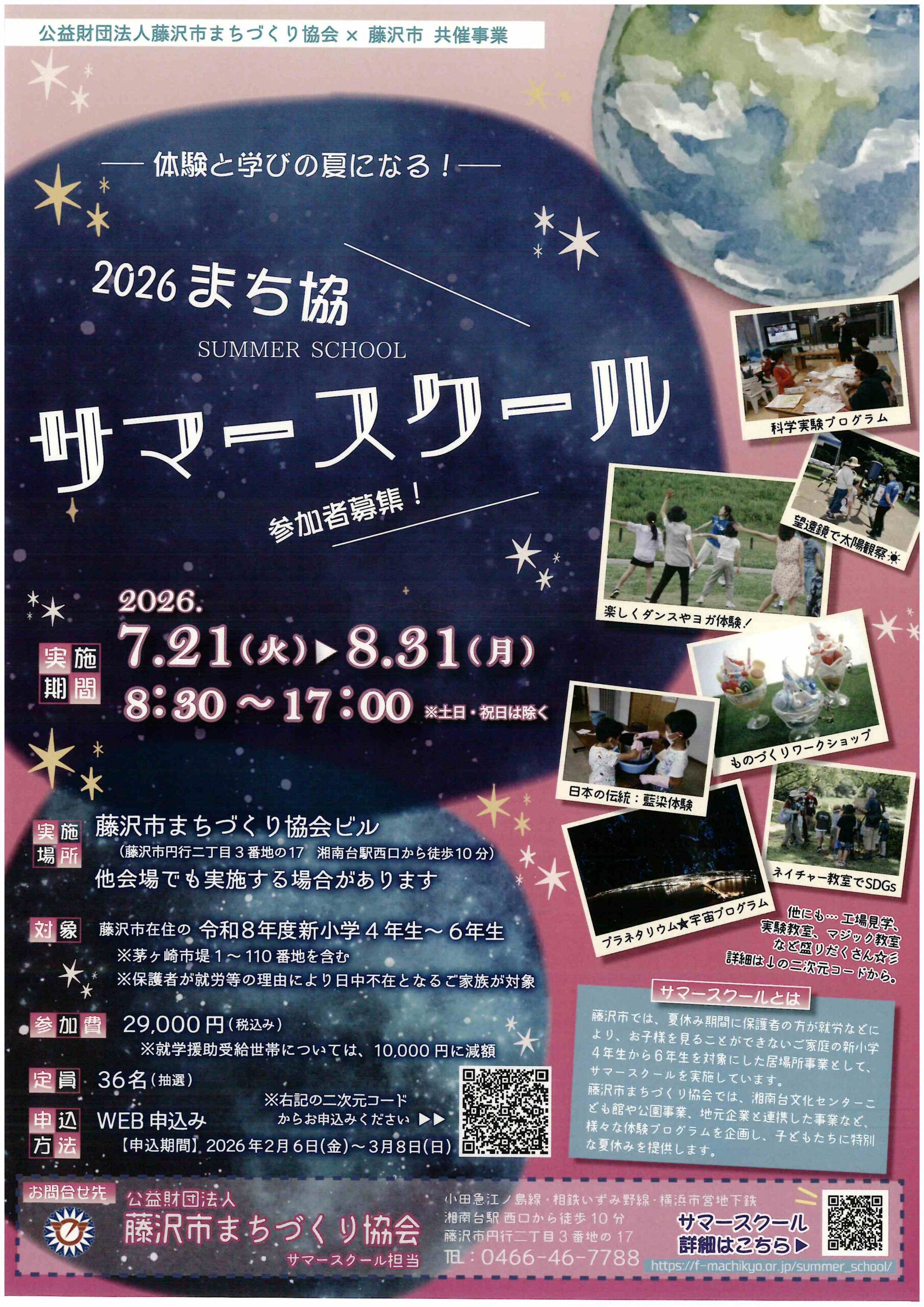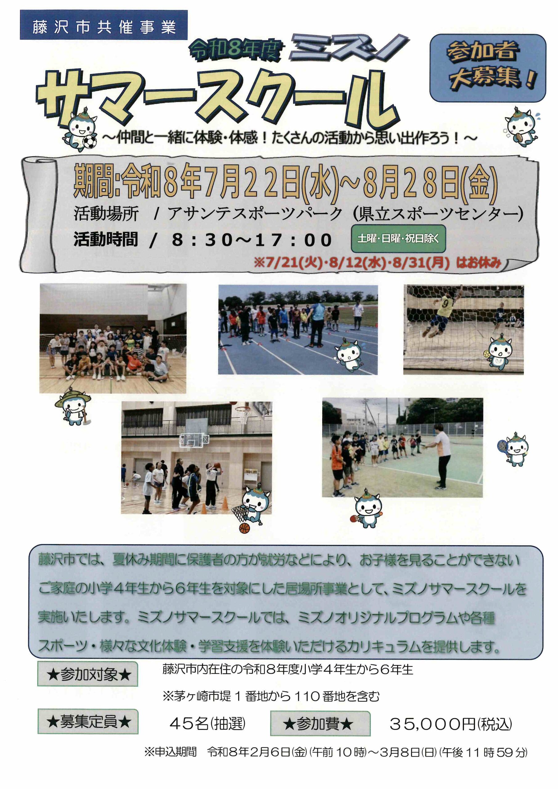 【期間】令和8年7月22日(水)~8月28日(金) ※土曜・日曜・祝日除く ※7/21(火)、8/12(水)はお休み 【参加対象】 藤沢市内在住の令和8年度 小学4年生から6年生 ※茅ケ崎市堤1-110番地含む※保護者が […]